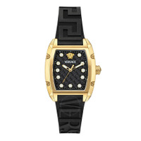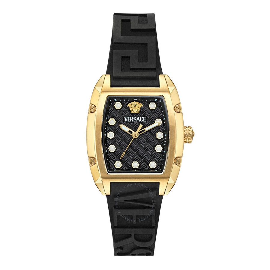 Gold-tone stainless steel case with a black silicone strap. Fixed gold-tone stainless steel bezel. Black guilloche dial with index hour markers. Dial Type: Analog. Luminescent hands and markers. Quartz movement. Scratch resistant sapphire crystal. Solid case back. Cushion case shape, case size: 36 mm. Buckle clasp. Water resistant at 50 meters / 165 feet. Functions: hour, minute, second. Dominus Series. Dress watch style. Watch label: Swiss Made. Versace Dominus Quartz Ladies Watch VE8K00624. GENERAL Box Type: Original Box Brand Type: Designer CASE Case Diameter: 36 Case Material: Stainless Steel Case Shape: Cushion Case Back: Solid BAND Band Material: Silicone Band Type: Strap Band Color: Black Clasp: Buckle DIAL Dial Color: Black GuillochA© Type: Analog Crystal: Scratch Resistant Sapphire Dial Markers: Index Luminiscence: Hands and Markers Bezel: Fixed Bezel Color: Gold-tone Bezel Material: Stainless Steel INFORMATION Brand: Versace Series: Dominus Collection Name: Dominus Gender: Womens Model: VE8K00624 Watch Label: Swiss Made Movement: Quartz FEATURES Water Resistance: 50 meters / 165 feet Functions: Hour, Minute, Second Watch Features: Analog, Gold, Stainless Steel ADDITIONAL INFO Watch Style: Dress Warranty: 2 Year Jomashop Warranty Jomashop Sku: VER-VE8K00624 Department: Watches