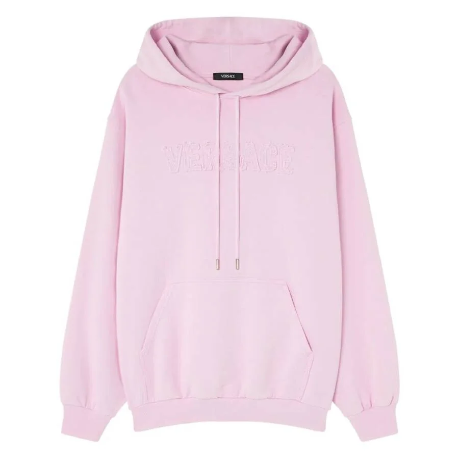 Versace Ladies Tops. Fashion category: Cardigans & Sweaters. SKU: 1018982-1A13617-95 PASTEL PINK. Color: 95 Pastel Pink. Versace Fringed Embroidered Logo Hoodie. This regular-fit hooded sweatshirt is made from soft cotton jersey and features a fringed Versace logo embroidery across the front. Designed with long sleeves, a drawstring hood, a kangaroo pocket, and elasticated waistband and cuffs for a comfortable, casual finish. 100% Cotton. GENERAL Brand Type: Designer Color: 95 Pastel Pink INFORMATION Brand: Versace Gender: Womens Model: 1018982-1A13617-95 PASTEL PINK DETAILS Category: Tops Apparel Type: Cardigans & Sweaters Material: Cotton ADDITIONAL INFO Jomashop Sku: -1A1361795PASTELPINK Department: Clothing