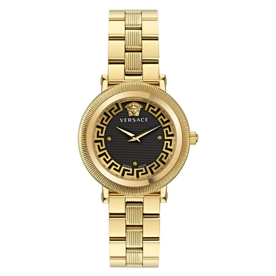 Gold-tone stainless steel case and bracelet. Fixed gold-tone stainless steel bezel. Black guilloche dial with gold-tone hands and index hour markers. Medusa at the 12 o'clock position. Dial Type: Analog. Quartz movement. Scratch resistant sapphire crystal. Pull / push crown. Solid case back. Round case shape, case size: 35 mm, case thickness: 8 mm. Band width: 16 mm. Deployment with push button release clasp. Water resistant at 50 meters / 165 feet. Functions: hour, minute. Greca Flourish Series. Dress watch style. Watch label: Swiss Made. Versace Greca Flourish Quartz Black Dial Ladies Watch VE7F00623. GENERAL Box Type: Original Box Brand Type: Designer CASE Case Diameter: 35 mm Case Thickness: 8 mm Case Material: Stainless Steel Case Shape: Round Case Back: Solid BAND Band Material: Stainless Steel Band Type: Bracelet Band Color: Gold-tone Band Width: 16 mm Clasp: Deployment with Push Button Release DIAL Dial Color: Black Guilloche Type: Analog Crystal: Scratch Resistant Sapphire Hands: Gold-tone Dial Markers: Index Second Markers: Medusa at the 12 o'clock position Bezel: Fixed Bezel Color: Gold-tone Bezel Material: Stainless Steel Crown: Pull / Push INFORMATION Brand: Versace Series: Greca Flourish Collection Name: Greca Flourish Gender: Womens Model: VE7F00623 Watch Label: Swiss Made Movement: Quartz FEATURES Water Resistance: 50 meters / 165 feet Functions: Hour, Minute Watch Features: Analog, Gold, Stainless Steel ADDITIONAL INFO Watch Style: Dress Warranty: 2 Year Jomashop Warranty Jomashop Sku: VER-VE7F00623 Department: Watches