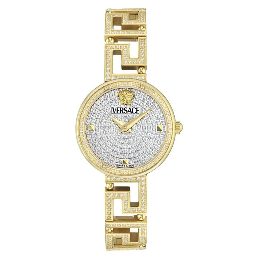 Gold-tone stainless steel case with a gold-tone stainless steel diamond set bracelet. Fixed gold-tone stainless steel diamond set bezel. Gold-tone hands. 3D medusa at 12 o' clock position. Dial Type: Analog. Quartz movement. Scratch resistant sapphire crystal. Pull / push crown. Solid case back. Round case shape, case size: 28 mm, case thickness: 7 mm. Band width: 12 mm. Deployment clasp. Water resistant at 30 meters / 100 feet. Functions: hour, minute. Greca Goddess Series. Dress watch style. Watch label: Swiss Made. Versace Greca Goddess Quartz Diamond Ladies Watch VE7A00524. GENERAL Box Type: Original Box Brand Type: Designer CASE Case Diameter: 28 mm Case Thickness: 7 mm Case Material: Stainless Steel Case Shape: Round Case Back: Solid BAND Band Material: Stainless Steel Diamond Set Band Type: Bracelet Band Color: Gold-tone Band Width: 12 mm Clasp: Deployment DIAL Type: Analog Crystal: Scratch Resistant Sapphire Hands: Gold-tone Second Markers: 3D Medusa at 12 o' clock position Bezel: Fixed Bezel Color: Gold-tone Bezel Material: Stainless Steel Diamond Set Crown: Pull / Push INFORMATION Brand: Versace Series: Greca Goddess Collection Name: Greca Goddess Gender: Womens Model: VE7A00524 Watch Label: Swiss Made Movement: Quartz FEATURES Water Resistance: 30 meters / 100 feet Functions: Hour, Minute Watch Features: Analog, Gold, Stainless Steel, Diamond ADDITIONAL INFO Watch Style: Dress Warranty: 2 Year Jomashop Warranty UPC Code: 7630615161044 Jomashop Sku: VER-VE7A00524 Department: Watches