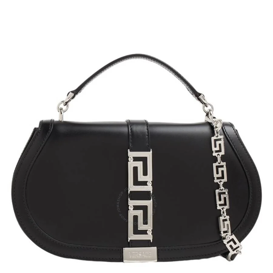 Versace Ladies Shoulder Bag. SKU: 10111781A051341B00P. Color: Black. Size: W: 10.2" x H: 5.5" x D: 2.8". Versace Greca Goddess Smooth Leather Shoulder Bag. The Greca Goddess bag provides versatile styling options with its detachable Greca chain and adjustable leather strap. Adorned with stylish silver-tone hardware, this bag features a structured silhouette crafted from luxurious calf leather. Its convenient snap button closure and two interior slip pockets. GENERAL Color: Black INFORMATION Brand: Versace Gender: Womens Model: 10111781A051341B00P DETAILS Material: Leather Closure: Snap DIMENSIONS Size: Small ADDITIONAL INFO UPC Code: 8056204346743 Jomashop Sku: Z-346G4 Department: Bags Category: Shoulder Bag