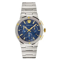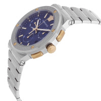 Silver-tone stainless steel case and bracelet. Fixed silver-tone stainless steel bezel. Blue dial with gold-tone hands and index hour markers. Medusa head marks the 12 o'clock position. Minute markers around the outer rim. Dial Type: Analog. Luminescent hands and markers. Date display at the 4 o'clock position. Three sub-dials displaying: 60 second, 30 minute and day of the week. Quartz movement. Scratch resistant sapphire crystal. Pull / push crown. Solid case back. Round case shape, case size: 43 mm, case thickness: 10.5 mm. Deployment with push button release clasp. Water resistant at 50 meters / 165 feet. Functions: chronograph, date, day, hour, minute, second. Greca Logo Series. Sport watch style. Watch label: Swiss Made. Versace Greca Logo Chronograph Quartz Blue Dial Men's Watch VEZ900221. CASE Case Size: 43 Case Thickness: 10.5 mm Case Material: Stainless Steel Case Shape: Round Case Back: Solid BAND Band Material: Stainless Steel Band Type: Bracelet Band Color: Silver-tone Clasp: Deployment with Push Button Release DIAL Dial Color: Blue Type: Analog Crystal: Scratch Resistant Sapphire Hands: Gold-tone Dial Markers: Index Second Markers: Medusa head marks the 12 o'clock position. Minute Markers around the outer rim Sub Dials: Three - 60 Second, 30 Minute and Day of the Week Luminiscence: Hands and Markers Bezel: Fixed Bezel Color: Silver-tone Bezel Material: Stainless Steel Crown: Pull / Push INFORMATION Brand: Versace Series: Greca Logo Collection Name: Greca Logo Gender: Mens Model: VEZ900221 Watch Label: Swiss Made Movement: Quartz FEATURES Water Resistance: 50 meters / 165 feet Calendar: Date display at the 4 o'clock position Functions: Chronograph, Date, Day, Hour, Minute, Second Watch Features: Chronograph, Stainless Steel, Gold, Analog ADDITIONAL INFO Watch Style: Sport Warranty: 2 Year Jomashop Warranty Jomashop Sku: VER-VEZ900221 Department: Watches