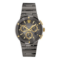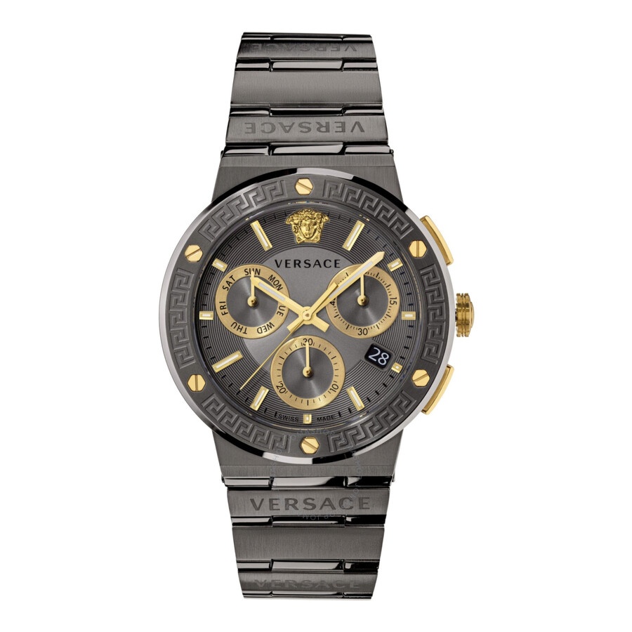 Gunmetal IP stainless steel case and bracelet. Fixed gunmetal IP stainless steel bezel. Grey dial with gold-tone hands and index hour markers. Medusa head marks the 12 o'clock position. Minute markers around the outer rim. Dial Type: Analog. Luminescent hands and markers. Date display at the 4 o'clock position. Three sub-dials displaying: 60 second, 30 minute and day of the week. Quartz movement. Scratch resistant sapphire crystal. Pull / push crown. Solid case back. Round case shape, case size: 43 mm. Deployment with push button release clasp. Water resistant at 50 meters / 165 feet. Functions: chronograph, date, day, hour, minute, second. Greca Logo Series. Sport watch style. Watch label: Swiss Made. Versace Greca Logo Chronograph Quartz Grey Dial Men's Watch VEZ900521. CASE Case Size: 43 Case Material: Stainless Steel Case Shape: Round Case Back: Solid BAND Band Material: Stainless Steel Band Type: Bracelet Band Color: Gunmetal IP Clasp: Deployment with Push Button Release DIAL Dial Color: Grey Type: Analog Crystal: Scratch Resistant Sapphire Hands: Gold-tone Dial Markers: Index Second Markers: Medusa head marks the 12 o'clock position. Minute Markers around the outer rim Sub Dials: Three - 60 Second, 30 Minute and Day of the Week Luminiscence: Hands and Markers Bezel: Fixed Bezel Color: Gunmetal IP Bezel Material: Stainless Steel Crown: Pull / Push INFORMATION Brand: Versace Series: Greca Logo Collection Name: Greca Logo Gender: Mens Model: VEZ900521 Watch Label: Swiss Made Movement: Quartz FEATURES Water Resistance: 50 meters / 165 feet Calendar: Date display at the 4 o'clock position Functions: Chronograph, Date, Day, Hour, Minute, Second Watch Features: Chronograph, Stainless Steel, Gold, Analog ADDITIONAL INFO Watch Style: Sport Warranty: 2 Year Jomashop Warranty UPC Code: 7630030582578 Jomashop Sku: VER-VEZ900521 Department: Watches