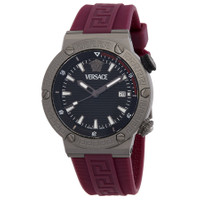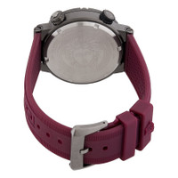 Silver-tone stainless steel case with a claret red silicone strap. Fixed silver-tone stainless steel bezel. Black dial with black hands and index hour markers. Minute markers around the outer rim. Dial Type: Analog. Luminescent hands and markers. Date display at the 3 o'clock position. Quartz movement. Scratch resistant sapphire crystal. Pull / push crown. Solid case back. Round case shape, case size: 43 mm. Tang clasp. Water resistant at 100 meters / 330 feet. Functions: date, hour, minute, second. Greca Logo Diver Series. Dress watch style. Watch label: Swiss Made. Versace Greca Logo Diver Quartz Black Dial Men's Watch VE8G00224. CASE Case Size: 43 Case Material: Stainless Steel Case Shape: Round Case Back: Solid BAND Band Material: Silicone Band Type: Strap Band Color: Claret Red Clasp: Tang DIAL Dial Color: Black Type: Analog Crystal: Scratch Resistant Sapphire Hands: Black Dial Markers: Index Second Markers: Minute Markers around the outer rim Luminiscence: Hands and Markers Bezel: Fixed Bezel Color: Silver-tone Bezel Material: Stainless Steel Crown: Pull / Push INFORMATION Brand: Versace Series: Greca Logo Diver Collection Name: Greca Logo Diver Gender: Mens Model: VE8G00224 Watch Label: Swiss Made Movement: Quartz FEATURES Water Resistance: 100 meters / 330 feet Calendar: Date display at the 3 o'clock position Functions: Date, Hour, Minute, Second Watch Features: Stainless Steel, Analog ADDITIONAL INFO Watch Style: Dress Warranty: 2 Year Jomashop Warranty Jomashop Sku: VER-VE8G00224 Department: Watches