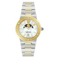 Silver-tone stainless steel case with a two-tone (silver-tone and gold-tone) stainless steel bracelet. Fixed gold-tone stainless steel bezel set with 6 diamonds (0.24 ct) on the top ring. White mother of pearl dial with gold-tone hands and index hour markers. Medusa at the 12 o'clock position. Dial Type: Analog. Date display at the 6 o'clock position. One subdial displaying: moonphase. Quartz movement. Scratch resistant sapphire crystal. Pull / push crown. Solid case back. Round case shape, case size: 38 mm, case thickness: 9 mm. Band width: 22 mm. Butterfly clasp. Water resistant at 50 meters / 165 feet. Functions: date, hour, minute, second, moonphase. Greca Logo Series. Casual watch style. Watch label: Swiss Made. Versace Greca Logo Moonphase Quartz Mother of Pearl Dial Ladies Watch VE7G00524. GENERAL Box Type: Original Box Brand Type: Designer CASE Case Thickness: 9 mm Case Material: Stainless Steel Case Shape: Round Case Back: Solid BAND Band Material: Stainless Steel Band Type: Bracelet Band Color: Two-tone (Silver-tone and Gold-tone) Band Width: 22 mm Clasp: Butterfly DIAL Dial Color: White Mother of Pearl Type: Analog Crystal: Scratch Resistant Sapphire Hands: Gold-tone Dial Markers: Index Second Markers: Medusa at the 12 o'clock position Sub Dials: One - Moonphase Bezel: Fixed Bezel Color: Gold-tone Bezel Material: Stainless Steel Set with 6 diamonds (0.24 ct) Crown: Pull / Push INFORMATION Brand: Versace Series: Greca Logo Collection Name: Greca Logo Gender: Womens Model: VE7G00524 Watch Label: Swiss Made Movement: Quartz FEATURES Water Resistance: 50 meters / 165 feet Calendar: Date display at the 6 o'clock position Functions: Date, Hour, Minute, Second, Moonphase Watch Features: Analog, Gold, Stainless Steel, Diamond ADDITIONAL INFO Watch Style: Casual Warranty: 2 Year Jomashop Warranty UPC Code: 7630615161068 Jomashop Sku: VER-VE7G00524 Department: Watches