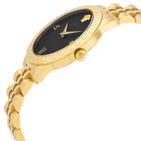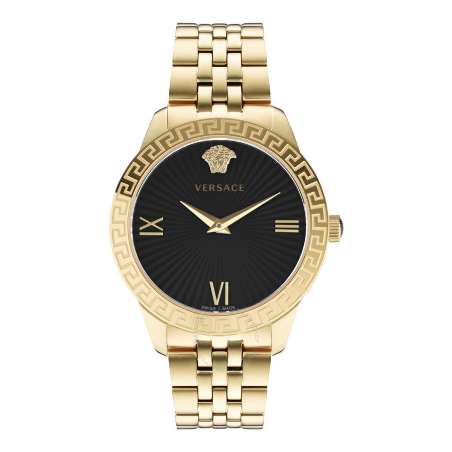 Gold-tone stainless steel case and bracelet. Fixed gold-tone stainless steel bezel. Black dial with gold-tone hands and Roman numeral hour markers. 3D medusa head at the 12 o'clock position. Dial Type: Analog. Quartz movement. Scratch resistant sapphire crystal. Pull / push crown. Solid case back. Round case shape, case size: 38 mm, case thickness: 7.3 mm. Fold over clasp with a safety release. Water resistant at 50 meters / 165 feet. Functions: hour, minute. Greca Signature Series. Dress watch style. Watch label: Swiss Made. Versace Greca Signature Black Dial Ladies Watch VEVC01121. CASE Case Size: 38 Case Thickness: 7.3 mm Case Material: Stainless Steel Case Shape: Round Case Back: Solid BAND Band Material: Stainless Steel Band Type: Bracelet Band Color: Gold-tone Clasp: Fold Over with Safety Release DIAL Dial Color: Black Type: Analog Crystal: Scratch Resistant Sapphire Hands: Gold-tone Dial Markers: Roman Numeral Second Markers: 3D Medusa head at the 12 o'clock position Bezel: Fixed Bezel Color: Gold-tone Bezel Material: Stainless Steel Crown: Pull / Push INFORMATION Brand: Versace Series: Greca Signature Collection Name: Greca Signature Gender: Womens Model: VEVC01121 Watch Label: Swiss Made Movement: Quartz FEATURES Water Resistance: 50 meters / 165 feet Functions: Hour, Minute Watch Features: Stainless Steel, Gold, Analog ADDITIONAL INFO Watch Style: Dress Warranty: With Manufacturers Guarantee UPC Code: 195768680134 Jomashop Sku: VER-VEVC01121 Department: Watches