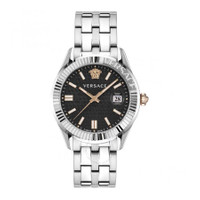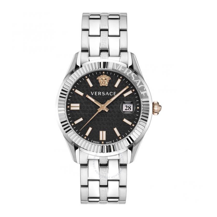 Silver-tone stainless steel case and bracelet. Fixed silver-tone stainless steel bezel. Black dial with gold-tone hands and index hour markers. Medusa head marks the 12 o'clock position. Minute markers around the outer rim. Dial Type: Analog. Luminescent hands and markers. Date display at the 3 o'clock position. Quartz movement. Scratch resistant sapphire crystal. Pull / push crown. Solid case back. Round case shape, case size: 41 mm. Deployment with push button release clasp. Water resistant at 50 meters / 165 feet. Functions: date, hour, minute, second. Greca Time Series. Casual watch style. Watch label: Swiss Made. Versace Greca Time Quartz Black Dial Men's Watch VE3K00322. INFORMATION Brand: Versace Series: Greca Time Collection Name: Greca Time Gender: Mens Model: VE3K00322 Watch Label: Swiss Made Movement: Quartz CASE Case Size: 41 mm Case Material: Stainless Steel Case Shape: Round Case Back: Solid BAND Band Material: Stainless Steel Band Type: Bracelet Band Color: Silver-tone Clasp: Deployment with Push Button Release DIAL Dial Color: Black Type: Analog Crystal: Scratch Resistant Sapphire Hands: Gold-tone Dial Markers: Index Second Markers: Medusa head marks the 12 o'clock position. Minute Markers around the outer rim Luminiscence: Hands and Markers Bezel: Fixed Bezel Color: Silver-tone Bezel Material: Stainless Steel Crown: Pull / Push FEATURES Water Resistance: 50 meters / 165 feet Calendar: Date display at the 3 o'clock position Functions: Date, Hour, Minute, Second Watch Features: Stainless Steel, Gold, Analog ADDITIONAL INFO Watch Style: Casual Warranty: 2 Year Jomashop Warranty UPC Code: 7630615115085 Jomashop Sku: Z-P9K8T Department: Watches