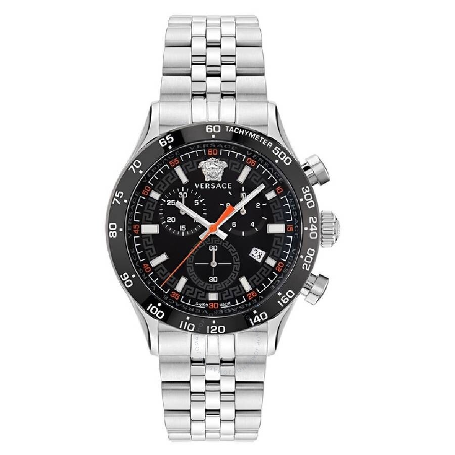 Silver-tone stainless steel case and bracelet. Fixed tachymeter scale black stainless steel bezel. Black dial with silver-tone hands and index hour markers. Medusa head marks the 12 o'clock position. Minute markers around the outer rim. Dial Type: Analog. Luminescent hands and markers. Date display at the 4 o'clock position. Chronograph - three sub-dials displaying: 60 second, 30 minute and 1/10th of a second. Quartz movement. Scratch resistant sapphire crystal. Pull / push crown. Solid case back. Round case shape, case size: 44 mm. Deployment with push button release clasp. Water resistant at 50 meters / 165 feet. Functions: chronograph, date, hour, minute, second. Hellenyium Series. Sport watch style. Watch label: Swiss Made. Versace Hellenyium Chronograph Quartz Black Dial Men's Watch VE2U00322. CASE Case Size: 44 Case Material: Stainless Steel Case Shape: Round Case Back: Solid BAND Band Material: Stainless Steel Band Type: Bracelet Band Color: Silver-tone Clasp: Deployment with Push Button Release DIAL Dial Color: Black Type: Analog Crystal: Scratch Resistant Sapphire Hands: Silver-tone Dial Markers: Index Second Markers: Medusa head marks the 12 o'clock position. Minute Markers around the outer rim Sub Dials: Three - 60 Second, 30 Minute and 1/10th of a Second Luminiscence: Hands and Markers Bezel: Fixed Tachymeter Scale Bezel Color: Black Bezel Material: Stainless Steel Crown: Pull / Push INFORMATION Brand: Versace Series: Hellenyium Collection Name: Hellenyium Gender: Mens Model: VE2U00322 Watch Label: Swiss Made Movement: Quartz FEATURES Water Resistance: 50 meters / 165 feet Calendar: Date display at the 4 o'clock position Functions: Chronograph, Date, Hour, Minute, Second Watch Features: Chronograph, Stainless Steel, Analog ADDITIONAL INFO Watch Style: Sport Warranty: 2 Year Jomashop Warranty UPC Code: 7630615104539 Jomashop Sku: VER-VE2U00322 Department: Watches