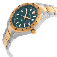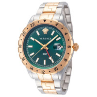 Silver-tone stainless steel case with a two-tone (silver-tone and rose gold-tone) stainless steel bracelet. Fixed rose gold-tone stainless steel bezel. Green dial with rose gold-tone hands and index hour markers. Minute markers around the outer rim. Dial Type: Analog. Luminescent hands and markers. Date display at the 3 o'clock position. Quartz movement. Scratch resistant sapphire crystal. Pull / push crown. Solid case back. Round case shape, case size: 42 mm. Deployment clasp. Water resistant at 50 meters / 165 feet. Functions: GMT, second time zone, date, hour, minute, second. Hellenyium Series. Sport watch style. Watch label: Swiss Made. Versace Hellenyium GMT Quartz Green Dial Men's Watch V11050016. CASE Case Size: 42 Case Material: Stainless Steel Case Shape: Round Case Back: Solid BAND Band Material: Stainless Steel Band Type: Bracelet Band Color: Two-tone (Silver-tone and Rose Gold-tone) Clasp: Deployment DIAL Dial Color: Green Type: Analog Crystal: Scratch Resistant Sapphire Hands: Rose Gold-tone Dial Markers: Index Second Markers: Minute Markers around the outer rim Luminiscence: Hands and Markers Bezel: Fixed Bezel Color: Rose Gold-tone Bezel Material: Stainless Steel Crown: Pull / Push INFORMATION Brand: Versace Series: Hellenyium Collection Name: Hellenyium Gender: Mens Model: V11050016 Watch Label: Swiss Made Movement: Quartz FEATURES Water Resistance: 50 meters / 165 feet Calendar: Date display at the 3 o'clock position Functions: GMT, Second Time Zone, Date, Hour, Minute, Second Watch Features: Time Zone, Stainless Steel, Gold, GMT, Analog ADDITIONAL INFO Watch Style: Sport Warranty: 2 Year Jomashop Warranty UPC Code: 7630030519703 Jomashop Sku: VER-V11050016 Department: Watches