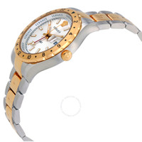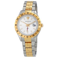 Silver-tone stainless steel case with a two-tone (silver and yellow gold-tone) stainless steel bracelet. Fixed yellow gold-tone stainless steel bezel. Silver dial with gold-tone hands and index hour markers. Minute markers around the outer rim. Dial Type: Analog. Luminescent hands and markers. Date display at the 3 o'clock position. Quartz movement. Scratch resistant sapphire crystal. Solid case back. Case size: 42 mm. Case thickness: 10 mm. Round case shape. Band width: 20 mm. Deployment with double push button release clasp. Water resistant at 50 meters / 165 feet. Functions: GMT, second time zone, hour, minute, second, date. Luxury watch style. Watch label: Swiss Made. Versace Hellenyium GMT Silver Dial Men's Watch V1103 0015. CASE Case Size: 42 Case Thickness: 10 mm Case Material: Stainless Steel Case Shape: Round Case Back: Solid BAND Band Material: Stainless Steel Band Type: Bracelet Band Color: Two-tone (Silver-tone and Yellow Gold-tone) Band Width: 20 mm Clasp: Deployment with Double Push Button Release DIAL Dial Color: Silver Type: Analog Crystal: Scratch Resistant Sapphire Hands: Gold-tone Dial Markers: Index Second Markers: Minute Markers around the outer rim Luminiscence: Hands and Markers Bezel: Fixed Bezel Color: Yellow Gold-tone Bezel Material: Stainless Steel INFORMATION Brand: Versace Series: Hellenyium Collection Name: Hellenyium Gender: Mens Model: V1103 0015 Watch Label: Swiss Made Movement: Quartz FEATURES Water Resistance: 50 meters / 165 feet Calendar: Date display at the 3 o'clock position Functions: GMT, Second Time Zone, Hour, Minute, Second, Date Watch Features: Time Zone, Stainless Steel, Gold, GMT, Analog ADDITIONAL INFO Watch Style: Luxury Warranty: 2 Year Jomashop Warranty UPC Code: 7630030510137 Jomashop Sku: VER-V11030015 Department: Watches Category: Watches