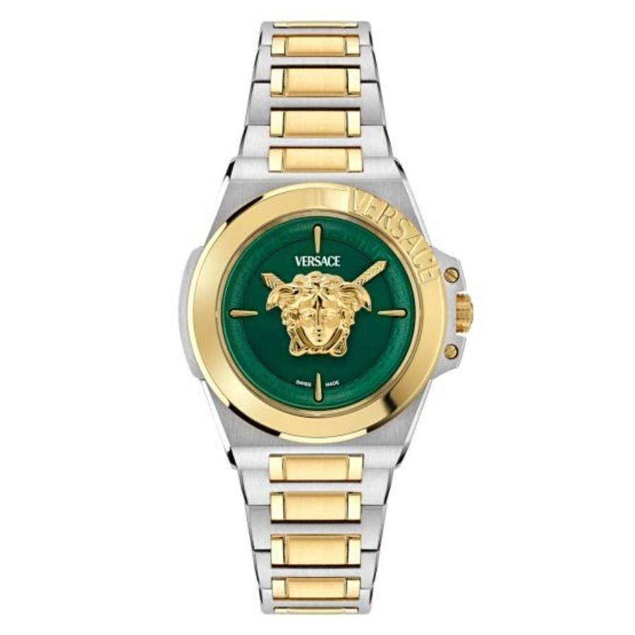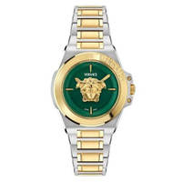 Silver-tone stainless steel case with a two-tone (silver-tone and gold-tone) stainless steel bracelet. Fixed gold-tone stainless steel bezel. Green dial with gold-tone hands and index hour markers. Dial Type: Analog. Ronda Caliber 762 quartz movement. Scratch resistant sapphire crystal. Pull / push crown. Solid case back. Round case shape, case size: 37 mm, case thickness: 12.4 mm. Deployment with push button release clasp. Water resistant at 50 meters / 165 feet. Functions: hour, minute. Hera Series. Dress watch style. Watch label: Swiss Movt. Versace Hera Quartz Green Dial Two-Tone Ladies Watch VE8D00524. GENERAL Box Type: Original Box Brand Type: Designer CASE Case Thickness: 12.4 mm Case Material: Stainless Steel Case Shape: Round Case Back: Solid BAND Band Material: Stainless Steel Band Type: Bracelet Band Color: Two-tone (Silver-tone and Gold-tone) Clasp: Deployment with Push Button Release DIAL Dial Color: Green Type: Analog Crystal: Scratch Resistant Sapphire Hands: Gold-tone Dial Markers: Index Bezel: Fixed Bezel Color: Gold-tone Bezel Material: Stainless Steel Crown: Pull / Push INFORMATION Brand: Versace Series: Hera Collection Name: Hera Gender: Womens Model: VE8D00524 Watch Label: Swiss Movt Movement: Quartz Engine: Ronda Caliber 762 FEATURES Water Resistance: 50 meters / 165 feet Functions: Hour, Minute Watch Features: Analog, Gold, Stainless Steel ADDITIONAL INFO Watch Style: Dress Warranty: 2 Year Jomashop Warranty UPC Code: 7630615148946 Jomashop Sku: VER-VE8D00524 Department: Watches