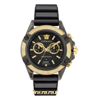 Transparent black polycarbonate case with a black polycarbonate band. Fixed bezel with polycarbonate diamond set. Black dial with gold-tone hands and diamond hour markers. Minute markers around the outer rim. Dial Type: Analog. Date display at the 6 o'clock position. Chronograph - two sub-dials displaying: 60 second and 30 minute. Quartz movement. Scratch resistant sapphire crystal. Pull / push crown. Solid case back. Round case shape, case size: 44 mm, case thickness: 13 mm. Buckle clasp. Water resistant at 30 meters / 100 feet. Functions: chronograph, date, hour, minute, second. Icon Active Series. Sport watch style. Watch label: Swiss Made. Versace Icon Active Chronograph Quartz Diamond Black Dial Men's Watch VEZ701723. GENERAL Box Type: Original Box Brand Type: Designer CASE Case Diameter: 44 Case Thickness: 13 mm Case Material: Polycarbonate Case Shape: Round Case Back: Solid BAND Band Material: Polycarbonate Band Type: Strap Band Color: Black Clasp: Buckle DIAL Dial Color: Black Type: Analog Crystal: Scratch Resistant Sapphire Hands: Gold-tone Dial Markers: Diamond Second Markers: Minute Markers around the outer rim Sub Dials: Two - 60 Second and 30 Minute Bezel: Fixed Bezel Material: Polycarbonate Diamond Set Crown: Pull / Push INFORMATION Brand: Versace Series: Icon Active Collection Name: Icon Active Gender: Mens Model: VEZ701723 Watch Label: Swiss Made Movement: Quartz FEATURES Water Resistance: 30 meters / 100 feet Calendar: Date display at the 6 o'clock position Functions: Chronograph, Date, Hour, Minute, Second Watch Features: Analog, Gold, Chronograph, Diamond ADDITIONAL INFO Watch Style: Sport Warranty: 2 Year Jomashop Warranty Jomashop Sku: VER-VEZ701723 Department: Watches