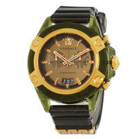 Green polycarbonate case with a black silicone strap. Fixed green polycarbonate bezel. Khaki dial with gold-tone hands and index hour markers. Minute markers around the outer rim. Medusa head marks the 12 o'clock position. Dial Type: Analog. Luminescent hands and markers. Date display at the 6 o'clock position. Chronograph - two sub-dials displaying: 60 second and 30 minute. Quartz movement. Scratch resistant sapphire crystal. Pull / push crown. Solid case back. Round case shape, case size: 44 mm. Tang clasp. Water resistant at 30 meters / 100 feet. Functions: chronograph, date, hour, minute, second. Icon Active Series. Sport watch style. Watch label: Swiss Made. Versace Icon Active Chronograph Quartz Men's Watch VEZ700321. INFORMATION Brand: Versace Series: Icon Active Collection Name: Icon Active Gender: Mens Model: VEZ700321 Watch Label: Swiss Made Movement: Quartz CASE Case Size: 44 mm Case Material: Polycarbonate Case Shape: Round Case Back: Solid BAND Band Material: Silicone Band Type: Strap Band Color: Black Clasp: Tang DIAL Dial Color: Khaki Type: Analog Crystal: Scratch Resistant Sapphire Hands: Gold-tone Dial Markers: Index Second Markers: Minute Markers around the outer rim. Medusa head marks the 12 o'clock position Sub Dials: Two - 60 Second and 30 Minute Luminiscence: Hands and Markers Bezel: Fixed Bezel Color: Green Bezel Material: Polycarbonate Crown: Pull / Push FEATURES Water Resistance: 30 meters / 100 feet Calendar: Date display at the 6 o'clock position Functions: Chronograph, Date, Hour, Minute, Second Watch Features: Chronograph, Gold, Analog ADDITIONAL INFO Watch Style: Sport Warranty: 2 Year Jomashop Warranty UPC Code: 7630030582073 Jomashop Sku: VER-VEZ700321 Department: Watches Category: Watches