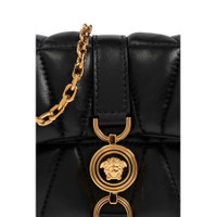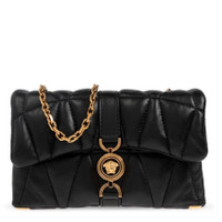 Versace Ladies Mini Bag. SKU: 1017740 1A12975 1B00V. Color: Black/Versace Gold. The Kleio Crossbody Mini Bag embodies Versace’s signature glamour in a compact, softly structured design. Crafted from quilted nappa leather, it features a plush, pillow-like texture that adds a touch of modern luxury. The iconic Medusa '95 hardware takes center stage on the foldover flap, lending timeless character to the silhouette. Inside, slip compartments offer practical organization for essentials, while the magnetic interlocking closure ensures a secure finish. A detachable chain strap allows for versatile styling, worn as a shoulder bag, crossbody, or carried as a chic clutch. 100% Lambskin Leather. Made in Italy. GENERAL Brand Type: Designer Color: Black/Versace Gold INFORMATION Brand: Versace Gender: Womens Model: 1017740 1A12975 1B00V ADDITIONAL INFO UPC Code: 8053609932984 Jomashop Sku: Z-PPN3G Department: Bags Category: Mini Bag