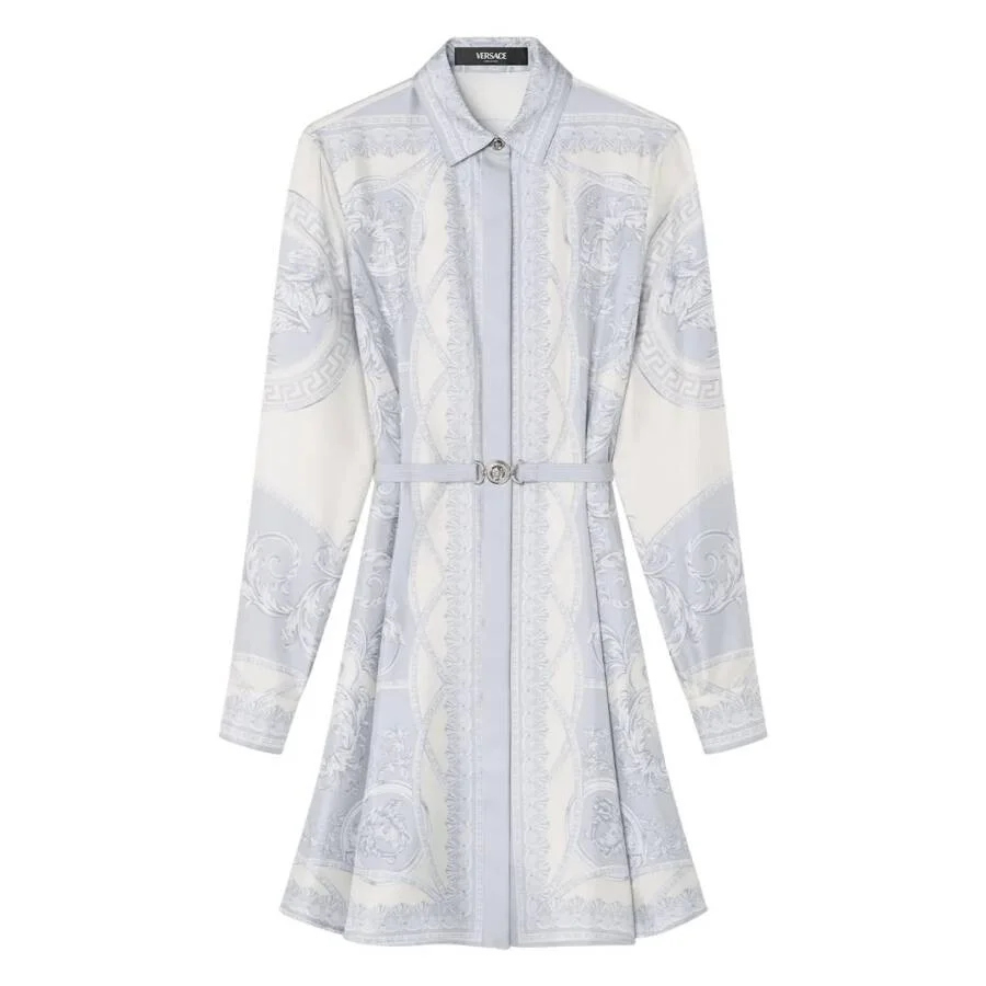 Versace Ladies Dresses. Fashion category: Casual Dresses. SKU: 1018933-1A13359. Color: Silver Grey/Champagne. Versace La Coupe Des Dieux Mini Shirt Dress. This mini shirt dress in twill showcases the La Coupe des Dieux print, featuring Barocco and classical motifs. Designed with a flared skirt and pointed collar, it is finished with a concealed front button placket, buttoned cuffs, and a detachable Medusa '95 belt to accentuate the waist. 100% Silk. Made in Italy. GENERAL Brand Type: Designer Color: Silver Grey/Champagne INFORMATION Brand: Versace Gender: Womens Model: 1018933-1A13359-SILVER GREY+CHAMPAG DETAILS Category: Dresses Apparel Type: Casual Dresses Material: Silk ADDITIONAL INFO Jomashop Sku: -59SILVERGREYCHAMPAG Department: Clothing