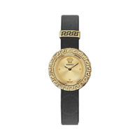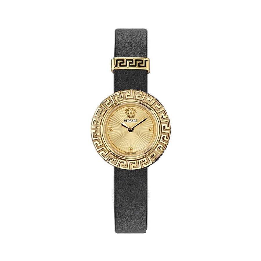 Gold-tone stainless steel case with a black leather strap. Fixed gold-tone stainless steel bezel. Gold-tone dial with gold-tone hands and dots hour markers. Dial Type: Analog. Ronda Caliber 762 quartz movement. Scratch resistant sapphire crystal. Pull / push crown. Solid case back. Round case shape, case size: 28 mm. Tang clasp. Water resistant at 30 meters / 100 feet. Functions: hour, minute. La Greca Series. Dress watch style. Watch label: Swiss Made. Versace La Greca Quartz Gold Dial Ladies Watch VE8C00224. CASE Case Size: 28 Case Material: Stainless Steel Case Shape: Round Case Back: Solid BAND Band Material: Leather Band Type: Strap Band Color: Black Clasp: Tang DIAL Dial Color: Gold-tone Type: Analog Crystal: Scratch Resistant Sapphire Hands: Gold-tone Dial Markers: Dots Bezel: Fixed Bezel Color: Gold-tone Bezel Material: Stainless Steel Crown: Pull / Push INFORMATION Brand: Versace Series: La Greca Collection Name: La Greca Gender: Womens Model: VE8C00224 Watch Label: Swiss Made Movement: Quartz Engine: Ronda Caliber 762 FEATURES Water Resistance: 30 meters / 100 feet Functions: Hour, Minute Watch Features: Stainless Steel, Leather, Gold, Analog ADDITIONAL INFO Watch Style: Dress Warranty: 2 Year Jomashop Warranty Jomashop Sku: VER-VE8C00224 Department: Watches