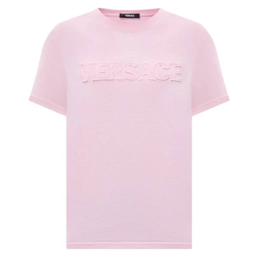 Versace Ladies Tops. Fashion category: T-Shirts & Henleys. SKU: 1018981-1A13616-95 PASTEL PINK. Color: Pastel Pink. Versace Logo-Applique Crewneck T-Shirt. Elevate your casual wardrobe with this Versace crewneck T-shirt, crafted from premium cotton for ultimate comfort and durability. Featuring short sleeves, the design is punctuated by an intricately embroidered logo on the front, showcasing the brand’s signature attention to detail and luxury aesthetic. Material: 100% cotton. Made in Portugal. GENERAL Brand Type: Designer Color: 95 Pastel Pink INFORMATION Brand: Versace Gender: Womens Model: 1018981-1A13616-95 PASTEL PINK DETAILS Category: Tops Apparel Type: T-Shirts & Henleys Material: Cotton ADDITIONAL INFO Jomashop Sku: -1A1361695PASTELPINK Department: Clothing