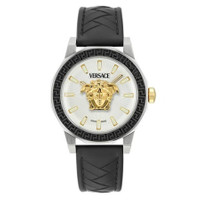 Silver-tone stainless steel case with a black leather strap. Fixed black stainless steel bezel. Silver dial with gold-tone hands and index hour markers. Dial Type: Analog. Quartz movement. Scratch resistant sapphire crystal. Pull / push crown. Solid case back. Round case shape, case size: 43 mm. Buckle clasp. Water resistant at 50 meters / 165 feet. Functions: hour, minute. Medusa Deco Series. Casual watch style. Watch label: Swiss Made. Versace Medusa Deco Quartz Silver Dial Men's Watch VE9I00124. GENERAL Box Type: Original Box Brand Type: Designer CASE Case Material: Stainless Steel Case Shape: Round Case Back: Solid BAND Band Material: Leather Band Type: Strap Band Color: Black Clasp: Buckle DIAL Dial Color: Silver Type: Analog Crystal: Scratch Resistant Sapphire Hands: Gold-tone Dial Markers: Index Bezel: Fixed Bezel Color: Black Bezel Material: Stainless Steel Crown: Pull / Push INFORMATION Brand: Versace Series: Medusa Deco Collection Name: Medusa Deco Gender: Mens Model: VE9I00124 Watch Label: Swiss Made Movement: Quartz FEATURES Water Resistance: 50 meters / 165 feet Functions: Hour, Minute Watch Features: Analog, Gold, Leather, Stainless Steel ADDITIONAL INFO Watch Style: Casual Warranty: 2 Year Jomashop Warranty UPC Code: 7630615160542 Jomashop Sku: VER-VE9I00124 Department: Watches
