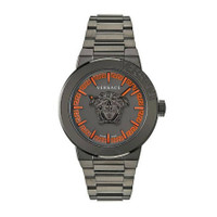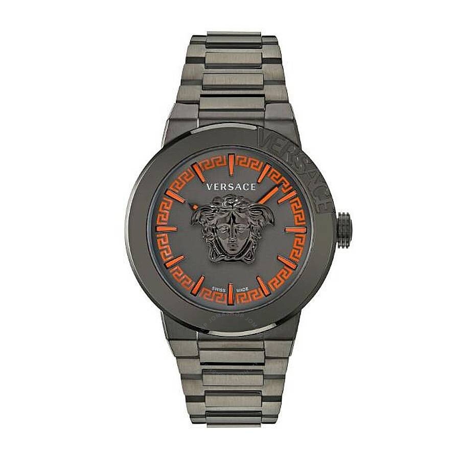Gunmetal IP stainless steel case and bracelet. Fixed gunmetal IP stainless steel bezel. Gunmetal dial with gunmetal hands and index hour markers. Dial Type: Analog. Quartz movement. Scratch resistant sapphire crystal. Pull / push crown. Solid case back. Round case shape, case size: 42 mm. Band width: 22 mm. Deployment with push button release clasp. Water resistant at 50 meters / 165 feet. Functions: hour, minute. Medusa Infinite Series. Dress watch style. Watch label: Swiss Made. Versace Medusa Infinite Quartz Gunmetal Dial Men's Watch VE7E00723. CASE Case Size: 42 Case Material: Stainless Steel Case Shape: Round Case Back: Solid BAND Band Material: Stainless Steel Band Type: Bracelet Band Color: Gunmetal IP Band Width: 22 mm Clasp: Deployment with Push Button Release DIAL Dial Color: Gunmetal Type: Analog Crystal: Scratch Resistant Sapphire Hands: Gunmetal Dial Markers: Index Bezel: Fixed Bezel Color: Gunmetal IP Bezel Material: Stainless Steel Crown: Pull / Push INFORMATION Brand: Versace Series: Medusa Infinite Collection Name: Medusa Infinite Gender: Mens Model: VE7E00723 Watch Label: Swiss Made Movement: Quartz FEATURES Water Resistance: 50 meters / 165 feet Functions: Hour, Minute Watch Features: Stainless Steel, Analog ADDITIONAL INFO Watch Style: Dress Warranty: 2 Year Jomashop Warranty Jomashop Sku: VER-VE7E00723 Department: Watches