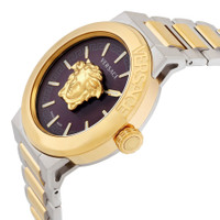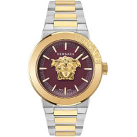 Gold-tone stainless steel case with a two-tone (silver-tone and gold-tone) stainless steel bracelet. Fixed gold-tone stainless steel bezel. Red dial with gold-tone hands and index hour markers. Dial Type: Analog. Quartz movement. Scratch resistant sapphire crystal. Pull / push crown. Solid case back. Round case shape, case size: 42 mm. Band width: 22 mm. Deployment with push button release clasp. Water resistant at 50 meters / 165 feet. Functions: hour, minute. Medusa Infinite Series. Dress watch style. Watch label: Swiss Made. Versace Medusa Infinite Quartz Red Dial Men's Watch VE7E00523. CASE Case Size: 42 Case Material: Stainless Steel Case Shape: Round Case Back: Solid BAND Band Material: Stainless Steel Band Type: Bracelet Band Color: Two-tone (Silver-tone and Gold-tone) Band Width: 22 mm Clasp: Deployment with Push Button Release DIAL Dial Color: Red Type: Analog Crystal: Scratch Resistant Sapphire Hands: Gold-tone Dial Markers: Index Bezel: Fixed Bezel Color: Gold-tone Bezel Material: Stainless Steel Crown: Pull / Push INFORMATION Brand: Versace Series: Medusa Infinite Collection Name: Medusa Infinite Gender: Mens Model: VE7E00523 Watch Label: Swiss Made Movement: Quartz FEATURES Water Resistance: 50 meters / 165 feet Functions: Hour, Minute Watch Features: Stainless Steel, Gold, Analog ADDITIONAL INFO Watch Style: Dress Warranty: 2 Year Jomashop Warranty Jomashop Sku: VER-VE7E00523 Department: Watches