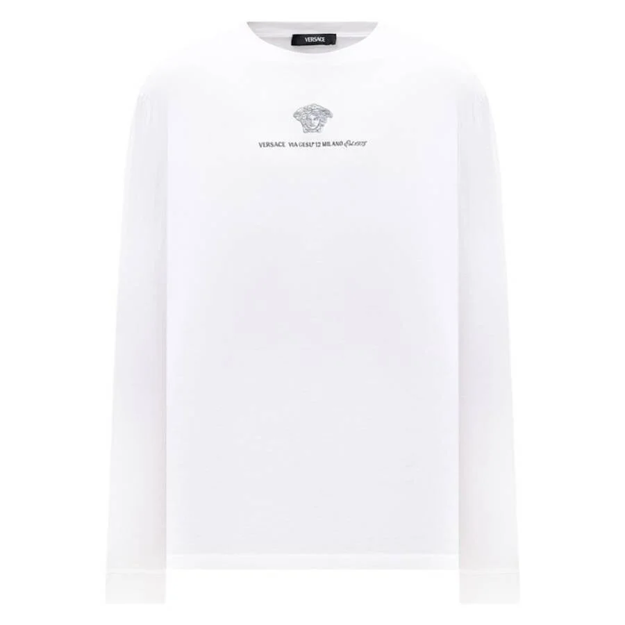Versace Men's Tops. Fashion category: T-Shirts & Henleys. SKU: 1013947-1A11054-OPTICAL WHITE. Color: Optical White. Versace Medusa Milano Cotton T-shirt. This relaxed-fit cotton T-shirt features a classic crewneck, long sleeves, and a straight hem. It's finished with a bold Medusa Milano logo print on the front, adding a signature touch to the laid-back silhouette. 100% cotton. GENERAL Brand Type: Designer Color: Optical White INFORMATION Brand: Versace Gender: Mens Model: 1013947-1A11054-OPTICAL WHITE DETAILS Category: Tops Apparel Type: T-Shirts & Henleys Material: Cotton ADDITIONAL INFO Jomashop Sku: -Y-A4CBBF Department: Clothing
