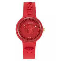 Red silicone case and strap. Fixed red silicone bezel. Red dial with gold-tone hands. No markers. Dial Type: Analog. Quartz movement. Scratch resistant mineral crystal. Pull / push crown. Solid case back. Round case shape, case size: 39 mm, case thickness: 12 mm. Band width: 18 mm. Tang clasp. Water resistant at 30 meters / 100 feet. Functions: hour, minute. Medusa Pop Series. Casual watch style. Watch label: Swiss Made. Versace Medusa Pop Quartz Red Dial Ladies Watch VE6G00723. GENERAL Box Type: Original Box Brand Type: Designer CASE Case Diameter: 39 mm Case Thickness: 12 mm Case Material: Silicone Case Shape: Round Case Back: Solid BAND Band Material: Silicone Band Type: Strap Band Color: Red Band Width: 18 mm Clasp: Tang DIAL Dial Color: Red Type: Analog Crystal: Scratch Resistant Mineral Hands: Gold-tone Second Markers: No Markers Bezel: Fixed Bezel Color: Red Bezel Material: Silicone Crown: Pull / Push INFORMATION Brand: Versace Series: Medusa Pop Collection Name: Medusa Pop Gender: Womens Model: VE6G00723 Watch Label: Swiss Made Movement: Quartz FEATURES Water Resistance: 30 meters / 100 feet Functions: Hour, Minute Watch Features: Analog, Gold ADDITIONAL INFO Watch Style: Casual Warranty: 2 Year Jomashop Warranty Jomashop Sku: VER-VE6G00723 Department: Watches