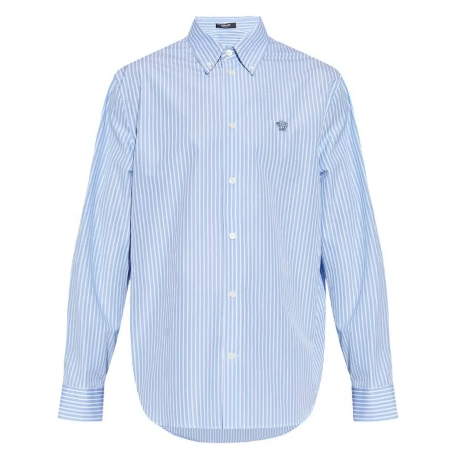 Versace Men's Tops. Fashion category: Casual Button-Downs. SKU: 1018832-1A13453-WHITE+LIGHT BLUE. Color: White/Light Blue. Versace Medusa Striped Long-Sleeve Shirt. Crafted from the finest cotton, this shirt offers exceptional comfort and timeless elegance. Its light blue hue, highlighted by crisp white vertical stripes, enhances the classic long-sleeve silhouette with a sharp collar. The chest is adorned with an embroidered Medusa head logo, a signature of the brand, adding a distinctive touch. Finished with a full-length button closure and a slightly tailored fit, this shirt combines sophistication with modern style. 100% Cotton. Made in Italy. GENERAL Brand Type: Designer Color: White/Light Blue INFORMATION Brand: Versace Gender: Mens Model: 1018832-1A13453-WHITE+LIGHT BLUE DETAILS Category: Tops Apparel Type: Casual Button-Downs Material: Cotton ADDITIONAL INFO Jomashop Sku: -13453WHITELIGHTBLUE Department: Clothing