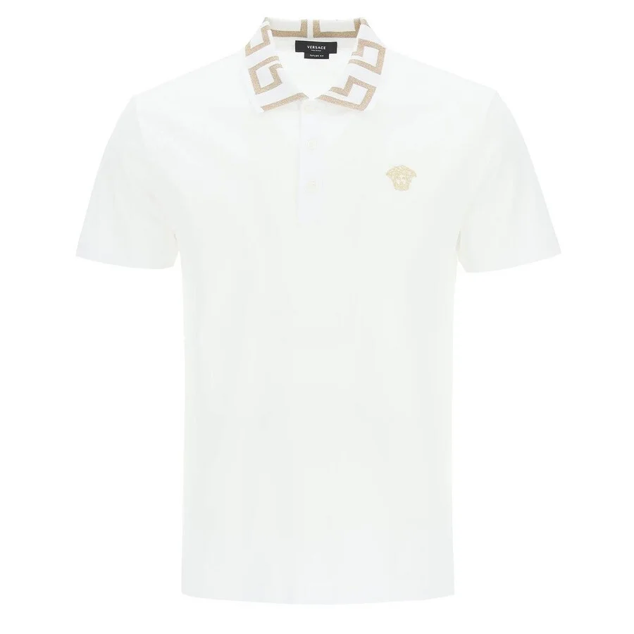 Versace Men's Tops. Fashion category: Shirts & Blouses. SKU: A87402-1A01552-A1001. Color: Optical White. Versace Men's Optical White Greca Embroidered Polo Shirt. Crafted from cotton pique, this polo shirt features the Greca motif on the collar in metallic threading with an embroidered Medusa at the chest, short sleeves, pointed collar and three-button placket. Outer: 100% Cotton. Embroidery: 60% Metallised polyester, 40% Viscose. GENERAL Brand Type: Designer Color: Optical White INFORMATION Brand: Versace Gender: Mens Model: A87402-1A01552-A1001 DETAILS Category: Tops Apparel Type: Shirts & Blouses ADDITIONAL INFO Jomashop Sku: -A874021A01552A1001 Department: Clothing
