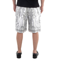 Versace Men's Bottoms. Fashion category: Shorts. SKU: 1006400-1A04840-5E110. Color: Silver/Black. The Silver Baroque silk shorts from Versace are a luxurious and stylish piece, perfect for making a bold fashion statement. These shorts combine the elegance of silk with the iconic Baroque pattern, characteristic of Versace's opulent style. Key Features: Material: Silk with a metallic finish. Pattern: Baroque-pattern print, a signature Versace design. Waistband: Elasticated for comfort and a secure fit. Pockets: Slip pockets on the sides. Rear welt pocket for added functionality. Length: Knee-length for a stylish and versatile look. These shorts are ideal for those who appreciate high-fashion details and luxurious fabrics, making them a standout addition to any wardrobe. GENERAL Color: Silver/Black INFORMATION Brand: Versace Gender: Mens Model: 1006400-1A04840-5E110 DETAILS Category: Bottoms Apparel Type: Shorts Material: Silk ADDITIONAL INFO Jomashop Sku: -10064001A048405E110 Department: Apparel