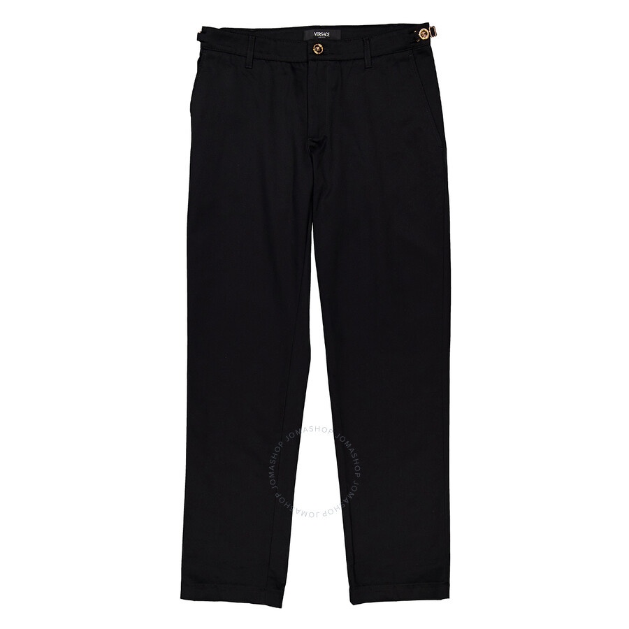Versace Men's Bottoms. Fashion category: Pants & Leggings. SKU: 1010583_1A01718-BLACK. Color: Black. Versace Mid-Rise Straight-Leg Trousers. This trouser features a Medusa plaque detail, signature Medusa Head buttons, an embroidered logo at the rear, a mid-rise waist, belt loops, front button and zip fastening, two side slash pockets, two rear welt pockets, and a straight leg. 100% Cotton. Made in Italy. GENERAL Size Info: 34 Brand Type: Designer Clothing Size: Men's Apparel Size: 34 Color: Black INFORMATION Brand: Versace Gender: Mens Model: 1010583_1A01718-BLACK DETAILS Category: Bottoms Apparel Type: Pants & Leggings Material: Cotton ADDITIONAL INFO UPC Code: 8056204970009 Jomashop Sku: Z-96UK2 Department: Clothing