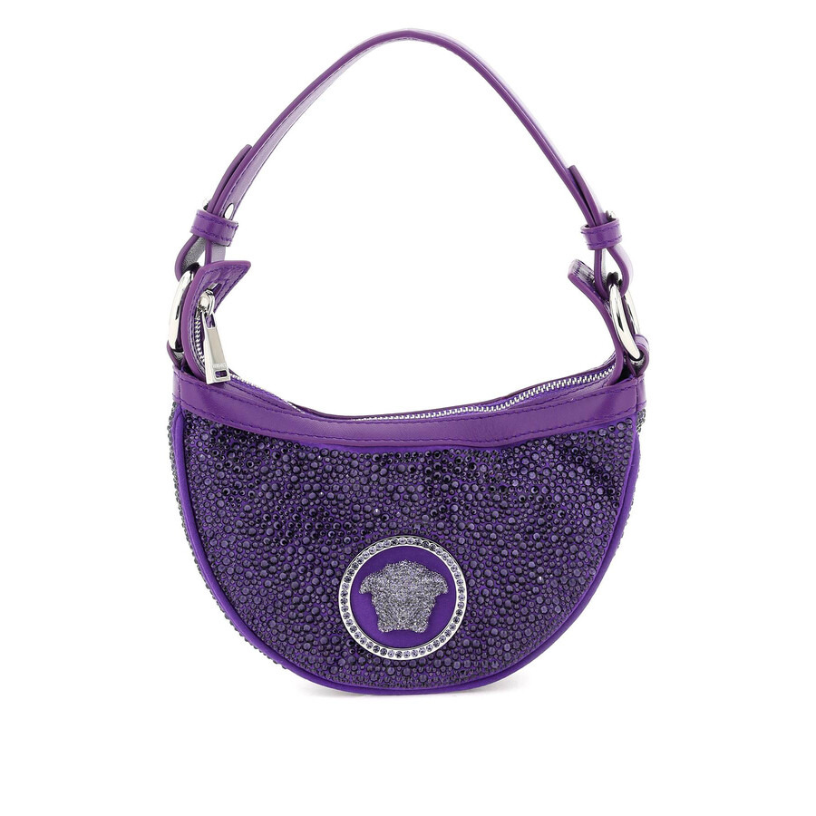 Versace Ladies Hobo. SKU: 10098191A06487_1LD2P. Color: Dark Orchid Palladium (Purple). Versace Mini Hobo Bag With Crystals. Outside: 72% Viscose, 28% Silk Trim: 100% Lamb skin. GENERAL Brand Type: Designer Color: Dark Orchid Palladium (Purple) INFORMATION Brand: Versace Gender: Womens Model: 10098191A06487_1LD2P ADDITIONAL INFO Jomashop Sku: Z-RNEHE Department: Bags Category: Hobo
