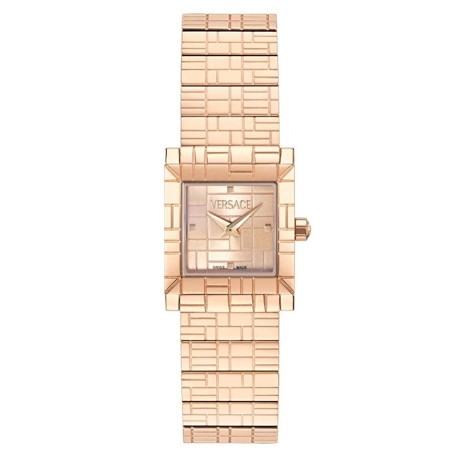 Rose gold-tone stainless steel case and bracelet. Fixed rose gold-tone stainless steel bezel. Rose gold-tone dial with rose gold-tone hands and index hour markers. Dial Type: Analog. Quartz movement. Scratch resistant sapphire crystal. Pull / push crown. Solid case back. Rectangle case shape, case size: 22 mm. Deployment with push button release clasp. Water resistant at 30 meters / 100 feet. Functions: hour, minute. Mosaic Series. Dress watch style. Watch label: Swiss Made. Versace Mosaic Quartz Rose Gold Dial Ladies Watch VE9B00224. GENERAL Box Type: Original Box Brand Type: Designer CASE Case Material: Stainless Steel Case Shape: Rectangle Case Back: Solid BAND Band Material: Stainless Steel Band Type: Bracelet Band Color: Rose Gold-tone Clasp: Deployment with Push Button Release DIAL Dial Color: Rose Gold-tone Type: Analog Crystal: Scratch Resistant Sapphire Hands: Rose Gold-tone Dial Markers: Index Bezel: Fixed Bezel Color: Rose Gold-tone Bezel Material: Stainless Steel Crown: Pull / Push INFORMATION Brand: Versace Series: Mosaic Collection Name: Mosaic Gender: Womens Model: VE9B00224 Watch Label: Swiss Made Movement: Quartz FEATURES Water Resistance: 30 meters / 100 feet Functions: Hour, Minute Watch Features: Analog, Gold, Stainless Steel ADDITIONAL INFO Watch Style: Dress Warranty: 2 Year Jomashop Warranty Jomashop Sku: VER-VE9B00224 Department: Watches