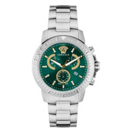 Silver-tone stainless steel case and bracelet. Silver-tone stainless steel bezel. Green dial with gold-tone hands and index hour markers. Medusa head marks the 12 o'clock position. Minute markers around the outer rim. Dial Type: Analog. Luminescent hands and markers. Date display between 4 and 5 o'clock position. Chronograph - three sub-dials displaying: 60 second, 30 minute and 1/10th of a second. Quartz movement. Scratch resistant sapphire crystal. Pull / push crown. Round case shape, case size: 45 mm. Deployment with push button release clasp. Water resistant at 50 meters / 165 feet. Functions: chronograph, date, hour, minute, second. New Chrono Series. Casual watch style. Watch label: Swiss Made. Versace New Chrono Chronograph Quartz Green Dial Men's Watch VE2E00821. CASE Case Size: 45 Case Material: Stainless Steel Case Shape: Round BAND Band Material: Stainless Steel Band Type: Bracelet Band Color: Silver-tone Clasp: Deployment with Push Button Release DIAL Dial Color: Green Type: Analog Crystal: Scratch Resistant Sapphire Hands: Gold-tone Dial Markers: Index Second Markers: Medusa head marks the 12 o'clock position. Minute Markers around the outer rim Sub Dials: Three - 60 Second, 30 Minute and 1/10th of a Second Luminiscence: Hands and Markers Bezel Color: Silver-tone Bezel Material: Stainless Steel Crown: Pull / Push INFORMATION Brand: Versace Series: New Chrono Collection Name: New Chrono Gender: Mens Model: VE2E00821 Watch Label: Swiss Made Movement: Quartz FEATURES Water Resistance: 50 meters / 165 feet Calendar: Date display between 4 and 5 o'clock position Functions: Chronograph, Date, Hour, Minute, Second Watch Features: Chronograph, Stainless Steel, Gold, Analog ADDITIONAL INFO Watch Style: Casual Warranty: 2 Year Jomashop Warranty UPC Code: 195768680530 Jomashop Sku: VER-VE2E00821 Department: Watches Category: Watches