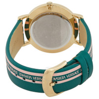 Gold-tone stainless steel case with a green leather strap. Fixed gold-tone stainless steel bezel. Green dial with gold-tone hands and index hour markers. Versace logo bordering a greca-patterned centerzone. Dial Type: Analog. Quartz movement. Scratch resistant sapphire crystal. Pull / push crown. Solid case back. Round case shape, case size: 36 mm. Tang clasp. Water resistant at 50 meters / 165 feet. Functions: hour, minute. New Generation Series. Casual watch style. Watch label: Swiss Made. Versace New Generation Quartz Green Dial Ladies Watch VE3M00322. CASE Case Size: 36 Case Material: Stainless Steel Case Shape: Round Case Back: Solid BAND Band Material: Leather Band Type: Strap Band Color: Green Clasp: Tang DIAL Dial Color: Green Type: Analog Crystal: Scratch Resistant Sapphire Hands: Gold-tone Dial Markers: Index Second Markers: Versace logo bordering a Greca-patterned centerzone Bezel: Fixed Bezel Color: Gold-tone Bezel Material: Stainless Steel Crown: Pull / Push INFORMATION Brand: Versace Series: New Generation Collection Name: New Generation Gender: Womens Model: VE3M00322 Watch Label: Swiss Made Movement: Quartz FEATURES Water Resistance: 50 meters / 165 feet Functions: Hour, Minute Watch Features: Stainless Steel, Leather, Gold, Analog ADDITIONAL INFO Watch Style: Casual Warranty: 2 Year Jomashop Warranty Jomashop Sku: VER-VE3M00322 Department: Watches Category: Watches