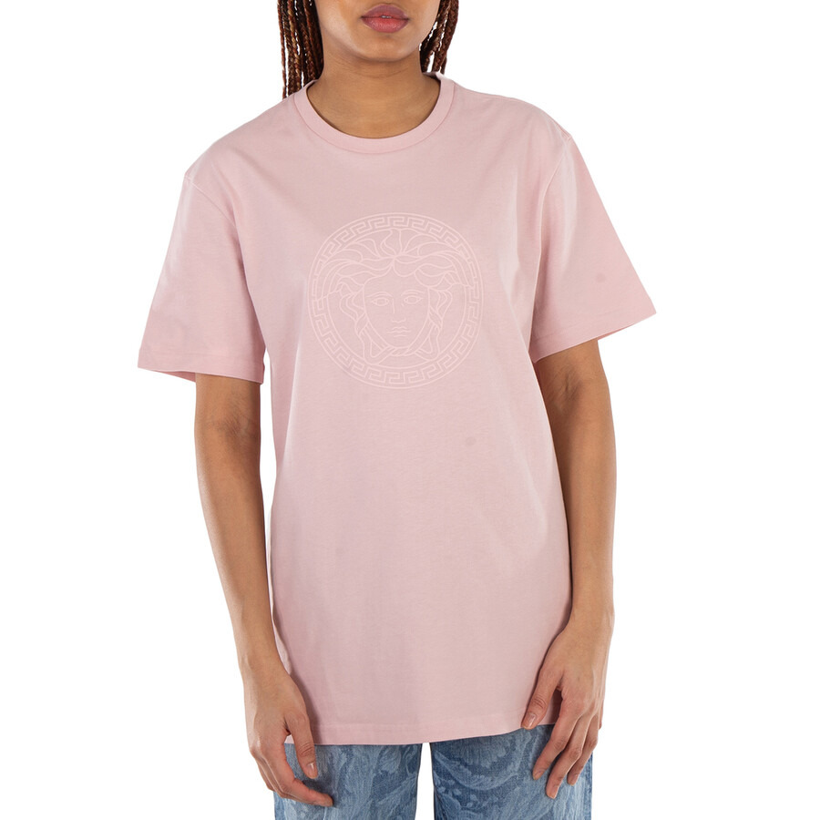 Versace Ladies Tops. Fashion category: T-Shirts & Henleys. SKU: 1013601-1A10844-DUSTY ROSE. Color: Dusty Rose. Versace Oversized Medusa Cotton T-Shirt. This cotton jersey T-shirt features a tonal Medusa motif, short sleeves, straight hem and a classic crewneck. 100% Cotton. Trim: 97% Cotton, 3% Elastane. GENERAL Color: Dusty Rose INFORMATION Brand: Versace Gender: Womens Model: 1013601-1A10844-DUSTY ROSE DETAILS Category: Tops Apparel Type: T-Shirts & Henleys Material: Cotton ADDITIONAL INFO Jomashop Sku: -6011A10844DUSTYROSE Department: Clothing