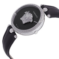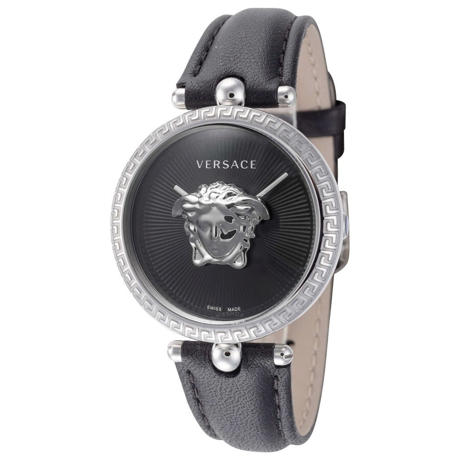 Silver-tone stainless steel case with a black leather strap. Fixed (greca motif) silver-tone stainless steel bezel. Black dial with silver-tone hands. No markers. Dial Type: Analog. Quartz movement. Scratch resistant sapphire crystal. Pull / push crown. Solid case back. Round case shape, case size: 34 mm. Buckle clasp. Water resistant at 50 meters / 165 feet. Functions: hour, minute. Additional Info: bold 3D medusa head floats above the center of the dial. Palazzo Empire Series. Casual watch style. Watch label: Swiss Made. Versace Palazzo Empire Quartz Black Dial Ladies Watch VECQ01020. CASE Case Size: 34 Case Thickness: 8 mm Case Material: Stainless Steel Case Shape: Round Case Back: Solid BAND Band Material: Leather Band Type: Strap Band Color: Black Band Width: 18 mm Clasp: Buckle DIAL Dial Color: Black Type: Analog Crystal: Scratch Resistant Sapphire Hands: Silver-tone Second Markers: No Markers Bezel: Fixed (Greca Motif) Bezel Color: Silver-tone Bezel Material: Stainless Steel Crown: Pull / Push INFORMATION Brand: Versace Series: Palazzo Empire Collection Name: Palazzo Empire Gender: Womens Model: VECQ01020 Watch Label: Swiss Made Movement: Quartz FEATURES Water Resistance: 50 meters / 165 feet Functions: Hour, Minute Watch Features: Stainless Steel, Leather, Analog ADDITIONAL INFO Watch Style: Casual Warranty: 2 Year Jomashop Warranty UPC Code: 7630030577871 Additional Info: Bold 3D Medusa Head floats above the center of the dial Jomashop Sku: VER-VECQ01020 Department: Watches
