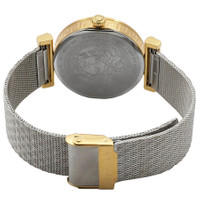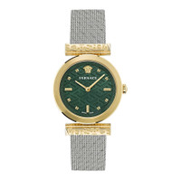 Gold-tone stainless steel case with a silver-tone stainless steel bracelet. Fixed gold-tone stainless steel bezel. Green dial with gold-tone hands and index hour markers. Medusa head marks the 12 o'clock position. Dial Type: Analog. Quartz movement. Scratch resistant sapphire crystal. Pull / push crown. Solid case back. Round case shape, case size: 34 mm. Fold over clasp. Water resistant at 30 meters / 100 feet. Functions: hour, minute. Regalia Series. Casual watch style. Watch label: Swiss Made. Versace Regalia Quartz Green Dial Ladies Watch VE6J00623. CASE Case Size: 34 Case Thickness: 8 mm Case Material: Stainless Steel Case Shape: Round Case Back: Solid BAND Band Material: Stainless Steel Band Type: Bracelet Band Color: Silver-tone Clasp: Fold Over DIAL Dial Color: Green Type: Analog Crystal: Scratch Resistant Sapphire Hands: Gold-tone Dial Markers: Index Second Markers: Medusa head marks the 12 o'clock position Bezel: Fixed Bezel Color: Gold-tone Bezel Material: Stainless Steel Crown: Pull / Push INFORMATION Brand: Versace Series: Regalia Collection Name: Regalia Gender: Womens Model: VE6J00623 Watch Label: Swiss Made Movement: Quartz FEATURES Water Resistance: 30 meters / 100 feet Functions: Hour, Minute Watch Features: Stainless Steel, Gold, Analog ADDITIONAL INFO Watch Style: Casual Warranty: 2 Year Jomashop Warranty Jomashop Sku: VER-VE6J00623 Department: Watches