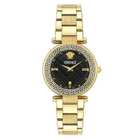 Gold-tone stainless steel case and bracelet. Fixed gold-tone stainless steel bezel. Black dial with gold-tone hands and index hour markers. Minute markers around the outer rim. Dial Type: Analog. Quartz movement. Scratch resistant sapphire crystal. Pull / push crown. Solid case back. Round case shape, case size: 35 mm. Deployment with push button release clasp. Water resistant at 50 meters / 165 feet. Functions: hour, minute. Reve Series. Dress watch style. Watch label: Swiss Movt. Versace Reve Quartz Black Dial Ladies Watch VE8B00624. GENERAL Box Type: Original Box Brand Type: Designer CASE Case Material: Stainless Steel Case Shape: Round Case Back: Solid BAND Band Material: Stainless Steel Band Type: Bracelet Band Color: Gold-tone Clasp: Deployment with Push Button Release DIAL Dial Color: Black Type: Analog Crystal: Scratch Resistant Sapphire Hands: Gold-tone Dial Markers: Index Second Markers: Minute Markers around the outer rim Bezel: Fixed Bezel Color: Gold-tone Bezel Material: Stainless Steel Crown: Pull / Push INFORMATION Brand: Versace Series: Reve Collection Name: Reve Gender: Womens Model: VE8B00624 Watch Label: Swiss Movt Movement: Quartz FEATURES Water Resistance: 50 meters / 165 feet Functions: Hour, Minute Watch Features: Analog, Gold, Stainless Steel ADDITIONAL INFO Watch Style: Dress Warranty: 2 Year Jomashop Warranty Jomashop Sku: VER-VE8B00624 Department: Watches