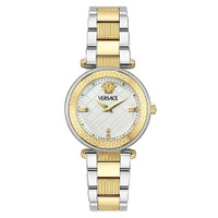 Silver-tone stainless steel case with a two-tone (silver-tone and gold-tone) stainless steel bracelet. Fixed silver-tone stainless steel bezel. White dial with gold-tone hands and index hour markers. Minute markers around the outer rim. Dial Type: Analog. Quartz movement. Scratch resistant sapphire crystal. Pull / push crown. Solid case back. Round case shape, case size: 35 mm. Deployment with push button release clasp. Water resistant at 50 meters / 165 feet. Functions: hour, minute. Reve Series. Dress watch style. Watch label: Swiss Movt. Versace Reve Quartz White Dial Ladies Watch VE8B00724. GENERAL Box Type: Original Box Brand Type: Designer CASE Case Material: Stainless Steel Case Shape: Round Case Back: Solid BAND Band Material: Stainless Steel Band Type: Bracelet Band Color: Two-tone (Silver-tone and Gold-tone) Clasp: Deployment with Push Button Release DIAL Dial Color: White Type: Analog Crystal: Scratch Resistant Sapphire Hands: Gold-tone Dial Markers: Index Second Markers: Minute Markers around the outer rim Bezel: Fixed Bezel Color: Silver-tone Bezel Material: Stainless Steel Crown: Pull / Push INFORMATION Brand: Versace Series: Reve Collection Name: Reve Gender: Womens Model: VE8B00724 Watch Label: Swiss Movt Movement: Quartz FEATURES Water Resistance: 50 meters / 165 feet Functions: Hour, Minute Watch Features: Analog, Gold, Stainless Steel ADDITIONAL INFO Watch Style: Dress Warranty: 2 Year Jomashop Warranty Jomashop Sku: Z-FM6DM Department: Watches