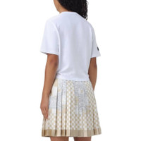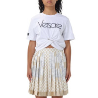 Versace Ladies Tops. Fashion category: T-Shirts & Henleys. SKU: 10113311A09120-2W020. Color: White/Black. Versace Safety Pin 1978 Logo T-Shirt. This cropped T-shirt features an embroidered Versace logo and a gathered hemline accented with iconic Safety Pin hardware. Designed with short sleeves and a classic crewneck, it offers a bold yet effortless statement look. 100% Cotton. Embroidery: 100% Polyester. Made in Portugal. GENERAL Brand Type: Designer Color: White/Black INFORMATION Brand: Versace Gender: Womens Model: 10113311A09120-2W020-WHITE+BLACK DETAILS Category: Tops Apparel Type: T-Shirts & Henleys Material: Cotton ADDITIONAL INFO Jomashop Sku: -91202W020WHITEBLACK Department: Clothing