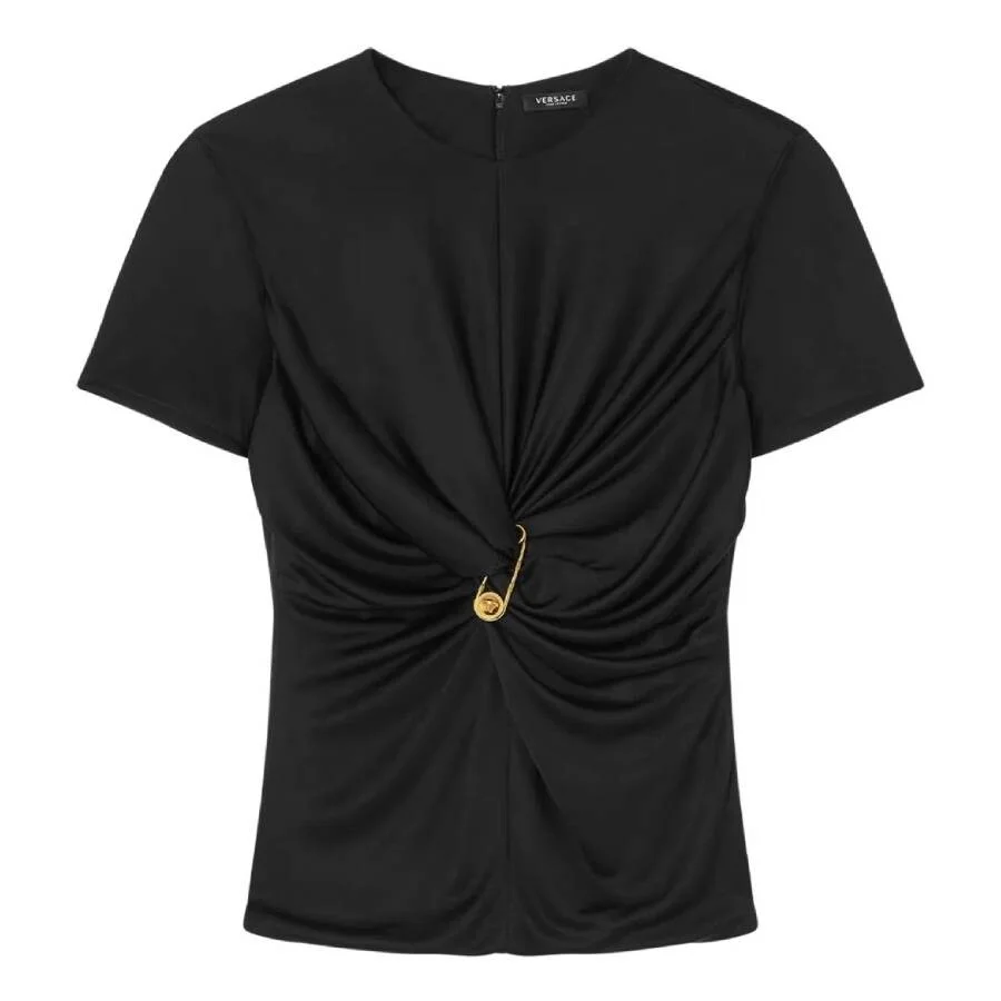 Versace Ladies Tops. Fashion category: Shirts & Blouses. SKU: 1018081-1A12497. Color: Black. Versace Safety Pin Gathered Viscose Top. This top is crafted from fluid liquid jersey and defined by the House’s signature Safety Pin detail. Finished with a round neckline, short sleeves and a slim fit. 100% Viscose. Made in Italy. GENERAL Brand Type: Designer Color: Black INFORMATION Brand: Versace Gender: Womens Model: 1018081-1A12497-BLACK DETAILS Category: Tops Apparel Type: Shirts & Blouses Material: Viscose ADDITIONAL INFO Jomashop Sku: -10180811A12497BLACK Department: Clothing