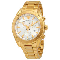 Gold-plated stainless steel case and bracelet. Fixed gold-plated bezel. White (greca pattern) dial with luminous gold-tone hands and index hour markers. Minute markers around the outer rim. The Medusa Head logo appears st the 12 o'clock position. Dial Type: Analog. Luminescent hands. Date display at the 4 o'clock position. Chronograph - three sub-dials displaying: 60 second, 30 minute and 1/10th of a second. Quartz movement. Scratch resistant sapphire crystal. Pull / push crown. Solid case back. Round case shape. Case size: 44 mm. Band width: 23 mm. Fold over clasp. Water resistant at 50 meters / 165 feet. Functions: chronograph, date, hour, minute, second. V-chrono Series. Dress watch style. Watch label: Swiss Made. Versace V-Chrono Chronograph Quartz White Dial Men's Watch VEHB00719. INFORMATION Brand: Versace Series: V-Chrono Collection Name: V-Chrono Gender: Mens Model: VEHB00719 Watch Label: Swiss Made Movement: Quartz CASE Case Size: 44 mm Case Material: Stainless Steel Case Shape: Round Case Back: Solid BAND Band Material: Stainless Steel Band Type: Bracelet Band Color: Gold-plated Band Width: 23 mm Clasp: Fold Over DIAL Dial Color: White (Greca Pattern) Type: Analog Crystal: Scratch Resistant Sapphire Hands: Luminous Gold-tone Dial Markers: Index Second Markers: Minute Markers around the outer rim Sub Dials: Three - 60 Second, 30 Minute and 1/10th of a Second Luminiscence: Hands Bezel: Fixed Bezel Color: Gold-plated Bezel Material: Stainless Steel Crown: Pull / Push FEATURES Water Resistance: 50 meters / 165 feet Calendar: Date display at the 4 o'clock position Functions: Chronograph, Date, Hour, Minute, Second Watch Features: Chronograph, Stainless Steel, Gold, Analog ADDITIONAL INFO Watch Style: Dress Warranty: 2 Year Jomashop Warranty UPC Code: 7630030554292 Jomashop Sku: VER-VEHB00719 Department: Watches Category: Watches