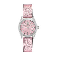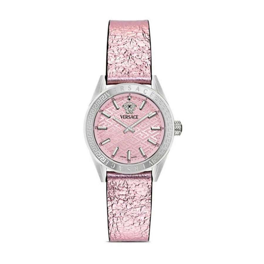 Silver-tone stainless steel case with a pink leather strap. Fixed silver-tone stainless steel bezel. Pink dial with silver-tone hands and index hour markers. Minute markers around the outer rim. Dial Type: Analog. Quartz movement. Scratch resistant sapphire crystal. Pull / push crown. Solid case back. Round case shape, case size: 36 mm. Tang clasp. Water resistant at 50 meters / 165 feet. Functions: hour, minute. V-code Series. Dress watch style. Watch label: Swiss Made. Versace V-Code Quartz Pink Dial Ladies Watch VE8I00124. CASE Case Size: 36 Case Material: Stainless Steel Case Shape: Round Case Back: Solid BAND Band Material: Leather Band Type: Strap Band Color: Pink Clasp: Tang DIAL Dial Color: Pink Type: Analog Crystal: Scratch Resistant Sapphire Hands: Silver-tone Dial Markers: Index Second Markers: Minute Markers around the outer rim Bezel: Fixed Bezel Color: Silver-tone Bezel Material: Stainless Steel Crown: Pull / Push INFORMATION Brand: Versace Series: V-Code Collection Name: V-Code Gender: Womens Model: VE8I00124 Watch Label: Swiss Made Movement: Quartz FEATURES Water Resistance: 50 meters / 165 feet Functions: Hour, Minute Watch Features: Stainless Steel, Leather, Analog ADDITIONAL INFO Watch Style: Dress Warranty: 2 Year Jomashop Warranty Jomashop Sku: VER-VE8I00124 Department: Watches