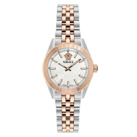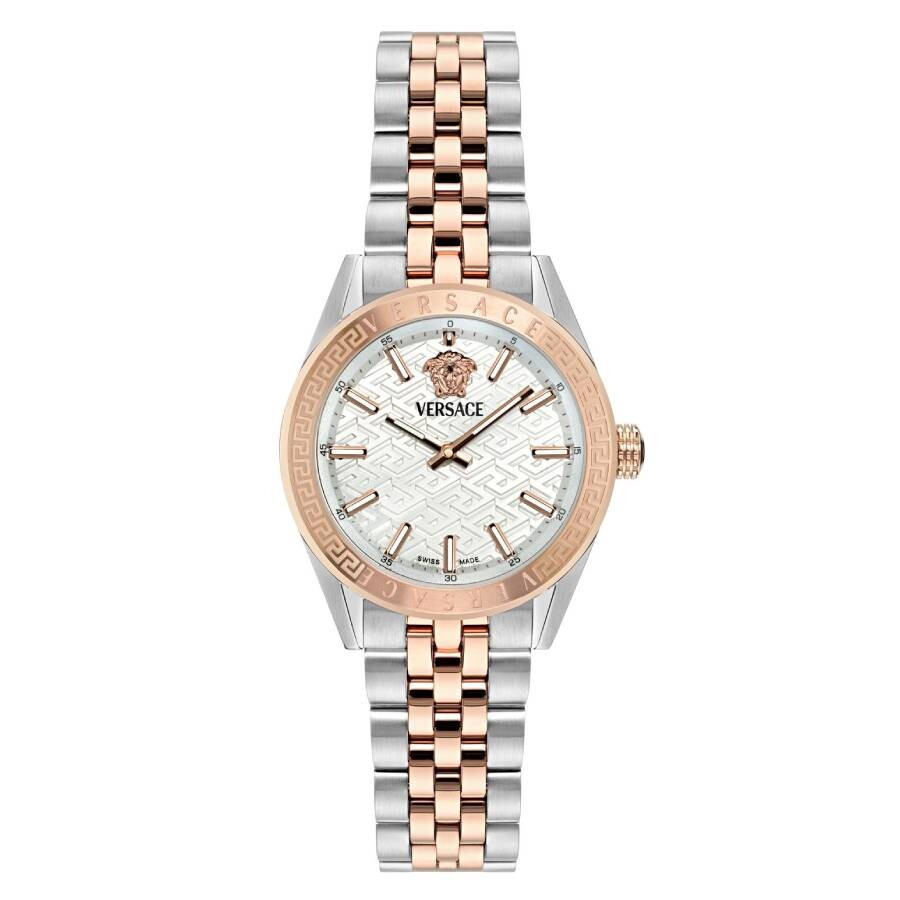 Silver-tone stainless steel case with a two-tone (silver-tone and rose gold-tone) stainless steel bracelet. Fixed rose gold-tone stainless steel bezel. Silver dial with rose gold-tone hands and index hour markers. Minute markers around the outer rim. Dial Type: Analog. Quartz movement. Scratch resistant sapphire crystal. Pull / push crown. Solid case back. Round case shape, case size: 36 mm. Water resistant at 50 meters / 165 feet. Functions: hour, minute. V-code Series. Dress watch style. Watch label: Swiss Made. Versace V-Code Quartz Silver Dial Ladies Watch VE8I00624. GENERAL Box Type: Original Box Brand Type: Designer CASE Case Material: Stainless Steel Case Shape: Round Case Back: Solid BAND Band Material: Stainless Steel Band Type: Bracelet Band Color: Two-tone (Silver-tone and Rose Gold-tone) Clasp: Deployment with Push Button Release DIAL Dial Color: Silver Type: Analog Crystal: Scratch Resistant Sapphire Hands: Rose Gold-tone Dial Markers: Index Second Markers: Minute Markers around the outer rim Bezel: Fixed Bezel Color: Rose Gold-tone Bezel Material: Stainless Steel Crown: Pull / Push INFORMATION Brand: Versace Series: V-Code Collection Name: V-Code Gender: Womens Model: VE8I00624 Watch Label: Swiss Made Movement: Quartz FEATURES Water Resistance: 50 meters / 165 feet Functions: Hour, Minute Watch Features: Analog, Gold, Stainless Steel ADDITIONAL INFO Watch Style: Dress Warranty: 2 Year Jomashop Warranty Jomashop Sku: Z-ETPUV Department: Watches