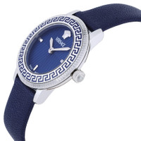 Silver-tone stainless steel case with a blue leather strap. Fixed silver-tone stainless steel bezel. Blue dial with silver-tone hands and index hour markers. Dial Type: Analog. Quartz movement. Scratch resistant sapphire crystal. Pull / push crown. Solid case back. Round case shape, case size: 30 mm. Buckle clasp. Water resistant at 30 meters / 100 feet. Functions: hour, minute. V-icon Series. Casual watch style. Watch label: Swiss Made. Versace V-Icon Quartz Blue Dial Ladies Watch VEUCA0124. GENERAL Box Type: Original Box Brand Type: Designer CASE Case Size: 30 Case Material: Stainless Steel Case Shape: Round Case Back: Solid BAND Band Material: Leather Band Type: Strap Band Color: Blue Clasp: Buckle DIAL Dial Color: Blue Type: Analog Crystal: Scratch Resistant Sapphire Hands: Silver-tone Dial Markers: Index Bezel: Fixed Bezel Color: Silver-tone Bezel Material: Stainless Steel Crown: Pull / Push INFORMATION Brand: Versace Series: V-Icon Collection Name: V-Icon Gender: Womens Model: VEUCA0124 Watch Label: Swiss Made Movement: Quartz FEATURES Water Resistance: 30 meters / 100 feet Functions: Hour, Minute Watch Features: Analog, Leather, Stainless Steel ADDITIONAL INFO Watch Style: Casual Warranty: 2 Year Jomashop Warranty Jomashop Sku: VER-VEUCA0124 Department: Watches
