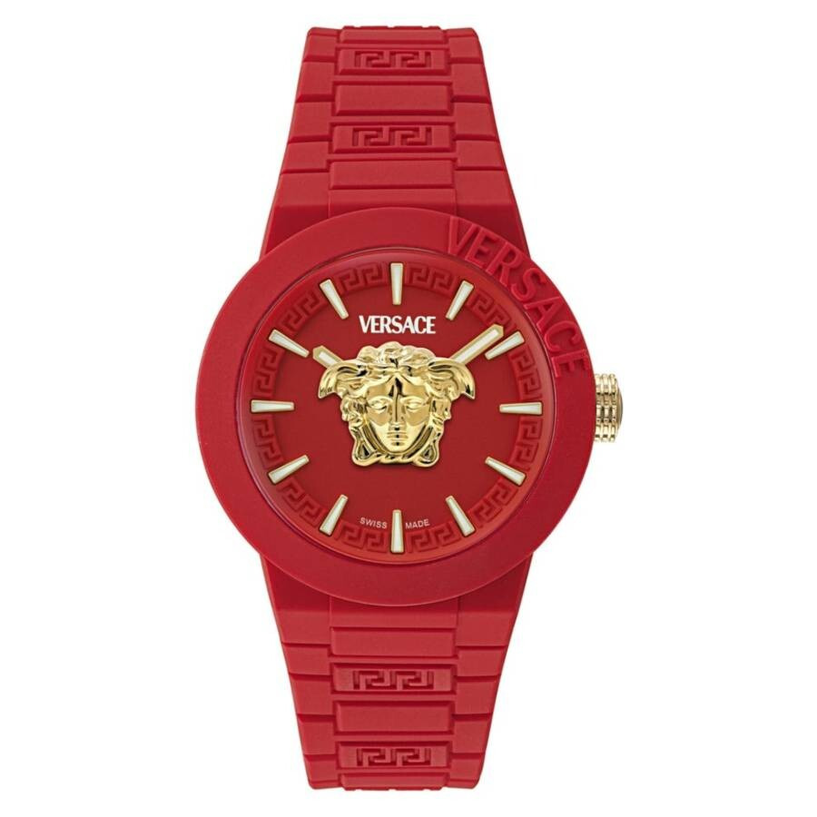 Red silicone case and strap. Fixed red silicone bezel. Red dial with gold-tone hands and index hour markers. Dial Type: Analog. Quartz movement. Scratch resistant mineral crystal. Pull / push crown. Solid case back. Round case shape, case size: 43 mm. Buckle clasp. Water resistant at 30 meters / 100 feet. Functions: hour, minute. V-pop Series. Casual watch style. Watch label: Swiss Made. Versace V-Pop Quartz Red Dial Men's Watch VEEFA0124. GENERAL Box Type: Original Box Brand Type: Designer CASE Case Material: Silicone Case Shape: Round Case Back: Solid BAND Band Material: Silicone Band Type: Strap Band Color: Red Clasp: Buckle DIAL Dial Color: Red Type: Analog Crystal: Scratch Resistant Mineral Hands: Gold-tone Dial Markers: Index Bezel: Fixed Bezel Color: Red Bezel Material: Silicone Crown: Pull / Push INFORMATION Brand: Versace Series: V-Pop Collection Name: V-Pop Gender: Mens Model: VEEFA0124 Watch Label: Swiss Made Movement: Quartz FEATURES Water Resistance: 30 meters / 100 feet Functions: Hour, Minute Watch Features: Analog, Gold ADDITIONAL INFO Watch Style: Casual Warranty: 2 Year Jomashop Warranty Jomashop Sku: VER-VEEFA0124 Department: Watches