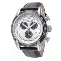 Silver-tone stainless steel case with a black leather strap. Fixed tachymeter scale black stainless steel bezel. Silver dial with silver-tone hands and index hour markers. Minute markers around the outer rim. Dial Type: Analog. Luminescent hands and markers. Date display at the 4 o'clock position. Chronograph - three sub-dials displaying: 60 second, 30 minute and 1/10th of a second. Quartz movement. Scratch resistant sapphire crystal. Pull / push crown. Solid case back. Round case shape, case size: 44 mm. Band width: 22 mm. Buckle clasp. Water resistant at 50 meters / 165 feet. Functions: chronograph, date, hour, minute, second. V-ray Series. Sport watch style. Watch label: Swiss Made. Versace V-Ray Chronograph Quartz Silver Dial Men's Watch VE2I00821. CASE Case Size: 44 Case Material: Stainless Steel Case Shape: Round Case Back: Solid BAND Band Material: Leather Band Type: Strap Band Color: Black Band Width: 22 mm Clasp: Buckle DIAL Dial Color: Silver Type: Analog Crystal: Scratch Resistant Sapphire Hands: Silver-tone Dial Markers: Index Second Markers: Minute Markers around the outer rim Sub Dials: Three - 60 Second, 30 Minute and 1/10th of a Second Luminiscence: Hands and Markers Bezel: Fixed Tachymeter Scale Bezel Color: Black Bezel Material: Stainless Steel Crown: Pull / Push INFORMATION Brand: Versace Series: V-Ray Collection Name: V-Ray Gender: Mens Model: VE2I00821 Watch Label: Swiss Made Movement: Quartz FEATURES Water Resistance: 50 meters / 165 feet Calendar: Date display at the 4 o'clock position Functions: Chronograph, Date, Hour, Minute, Second Watch Features: Chronograph, Stainless Steel, Leather, Analog ADDITIONAL INFO Watch Style: Sport Warranty: 2 Year Jomashop Warranty UPC Code: 7630615101712 Jomashop Sku: VER-VE2I00821 Department: Watches