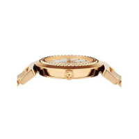 Rose gold-tone case with a rose gold-tone stainless steel bracelet. Fixed rose gold-tone stainless steel bezel. Silver dial with rose gold-tone hands and dots-Roman numeral hour markers. Dial Type: Analog. Quartz movement. Scratch resistant sapphire crystal. Pull / push crown. Solid case back. Round case shape, case size: 34 mm, case thickness: 8 mm. Band width: 18 mm, band length: 7.5 inches. Fold over clasp with a safety release. Water resistant at 30 meters / 100 feet. Functions: hour, minute. Vanity Series. Dress watch style. Watch label: Swiss Made. Versace Vanity Quartz Silver Dial Ladies Watch P5Q80D001S080. GENERAL Box Type: Original Box Brand Type: Designer CASE Case Diameter: 34 mm Case Thickness: 8 mm Case Shape: Round Case Back: Solid BAND Band Material: Stainless Steel Band Type: Bracelet Band Color: Rose Gold-tone Band Length: 7.5 inches Band Width: 18 mm Clasp: Fold Over with Safety Release DIAL Dial Color: Silver Type: Analog Crystal: Scratch Resistant Sapphire Hands: Rose Gold-tone Dial Markers: Dots-Roman Numeral Bezel: Fixed Bezel Color: Rose Gold-tone Bezel Material: Stainless Steel Crown: Pull / Push INFORMATION Brand: Versace Series: Vanity Collection Name: Vanity Gender: Womens Model: P5Q80D001S080 Watch Label: Swiss Made Movement: Quartz FEATURES Water Resistance: 30 meters / 100 feet Functions: Hour, Minute Watch Features: Analog, Gold, Stainless Steel ADDITIONAL INFO Watch Style: Dress Warranty: 2 Year Jomashop Warranty Jomashop Sku: VER-P5Q80D001S080 Department: Watches