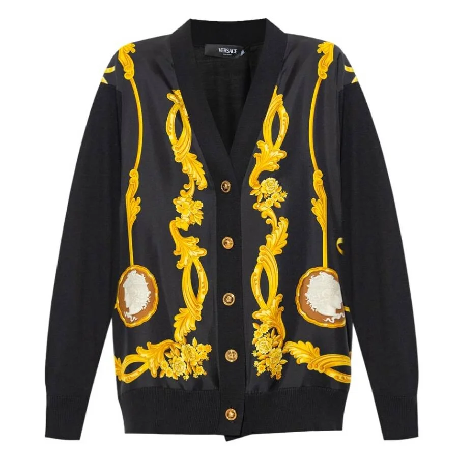 Versace Ladies Tops. Fashion category: Hoodies & Sweatshirts. SKU: 1016172-1A14431-BLACK+GOLD. Color: Black/Gold. Versace Womens Baroque Printed V-Neck Cardigan. This cardigan features a front button closure, long sleeves, and ribbed cuffs and hem. It is adorned with the brand’s signature Barocco print for a bold, iconic look. Virgin Wool 100%, Silk 100% Made in Italy. GENERAL Brand Type: Designer Color: Black/Gold INFORMATION Brand: Versace Gender: Womens Model: 1016172-1A14431-BLACK+GOLD DETAILS Category: Tops Apparel Type: Hoodies & Sweatshirts Material: Silk, Wool ADDITIONAL INFO Jomashop Sku: -1721A14431BLACKGOLD Department: Clothing