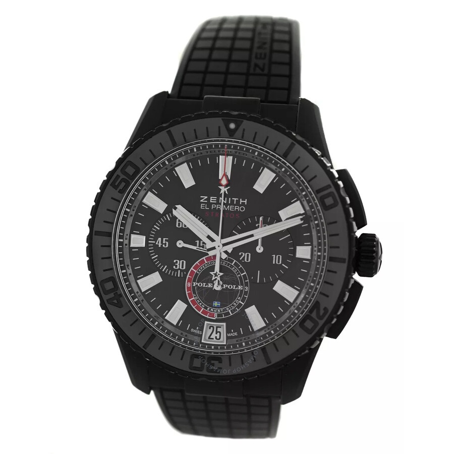 Black stainless steel case with a black rubber strap. Uni-directional rotating black stainless steel bezel. Black dial with silver-tone hands and Arabic numeral & index hour markers. Minute markers around the outer rim. Dial Type: Analog. Luminescent hands and markers. Date display at the 6 o'clock position. Chronograph - three sub-dials displaying: 60 second, 30 minute and 12 hour. Zenith Calibre El Primero 405B Automatic movement, based upon Zenith El Primero 400, containing 31 Jewels, composed of 331 parts, bitting at 36000 vph, and has a power reserve of approximately 50 hours. Scratch resistant sapphire crystal. Transparent see through case back. Round case shape, case size: 45 mm. Band length: 8.75 inches. Deployment with push button release clasp. Water resistant at 100 meters / 330 feet. Functions: chronograph, column wheel, flyback, date, hour, minute, small second. El Primero Stratos Flyback Series. Luxury watch style. Watch label: Swiss Made. Item Variations: 24 2062 405/27 C707, 24-2062-405/27-C707, 24/2062/405/27/C707, 242062405/27C707. Pre-owned Zenith El Primero Stratos Flyback Chronograph Automatic Black Dial Men's Watch 24.2062.405. GENERAL Collection Name: El Primero Stratos Flyback INFORMATION Brand: Zenith Series: El Primero Stratos Flyback Model: 24.2062.405 Gender: Mens Watch Label: Swiss Made Movement: Automatic Engine: Zenith Calibre El Primero 405B Power Reserve: 50 hours CONDITION INFORMATION Box: Yes Preowned Item Condition: Excellent Papers: Yes CASE Case Size: 45 Case Material: Stainless Steel Case Shape: Round Case Back: Transparent See Through DIAL Type: Analog Dial Color: Black Crystal: Scratch Resistant Sapphire Hands: Silver-tone Second Markers: Minute Markers around the outer rim Dial Markers: Arabic Numeral & Index Sub Dials: Three - 60 Second, 30 Minute and 12 Hour Luminiscence: Hands and Markers Bezel: Uni-directional Rotating Bezel Color: Black Bezel Material: Stainless Steel BAND Band Type: Strap Band Material: Rubber Band Color: Black Band Length: 8.75 inches Clasp: Deployment with Push Button Release FEATURES Water Resistance: 100 meters / 330 feet Calendar: Date display at the 6 o'clock position Functions: Chronograph, Column Wheel, FlyBack, Date, Hour, Minute, Small Second Watch Features: Chronograph, Stainless Steel, Rubber, Flyback, Analog ADDITIONAL INFO Watch Style: Luxury Warranty: 1 Year Jomashop Warranty Jomashop Sku: PRE-P-ZE85914 Item Variation: 24 2062 405/27 C707, 24-2062-405/27-C707, 24/2062/405/27/C707, 242062405/27C707 Department: Watches